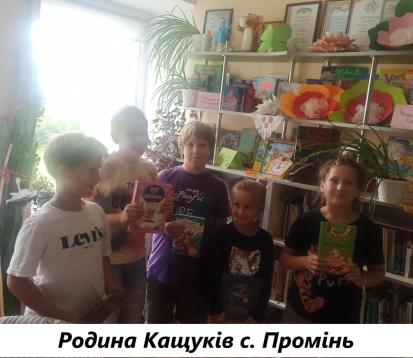 Читання в родині Кащуків з села Промінь – це сімейна традиція. У цій родині всіх дітей з раннього дитинства навчають любити читання та цінувати книжку, адже книги для дітей – це розвиток і пізнання. Любов до читання у цій родині передається у спадок, бабуся Людмила доки жила в Промені часто відвідувала книгозбірню та захоплювалась українською класикою, мама Людмила теж з дитинства була активною читачкою бібліотеки і зараз прищеплює любов до книги своїм дітям. Найактивніше, ще з дошкільного віку, відвідує бібліотеку та читає дочка Людмила, але вона завжди приходить зі своїми братиками Тимуром та Павлом і сестричками Марією та Сашою. Казки і комікси, пригоди та дитячі детективи, книги за шкільною програмою – цьому надають перевагу юні користувачі бібліотеки.