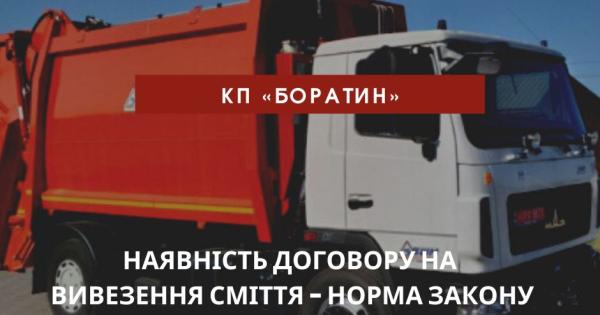 Комунальне підприємство «Боратин» наголошує, що збирання та вивезення твердих побутових відходів (ТПВ) здійснюється лише за умови наявності договору. Ця норма стосується усіх фізичних та юридичних осіб, суб’єктів господарювання, що здійснюють діяльність на території Боратинської громади.