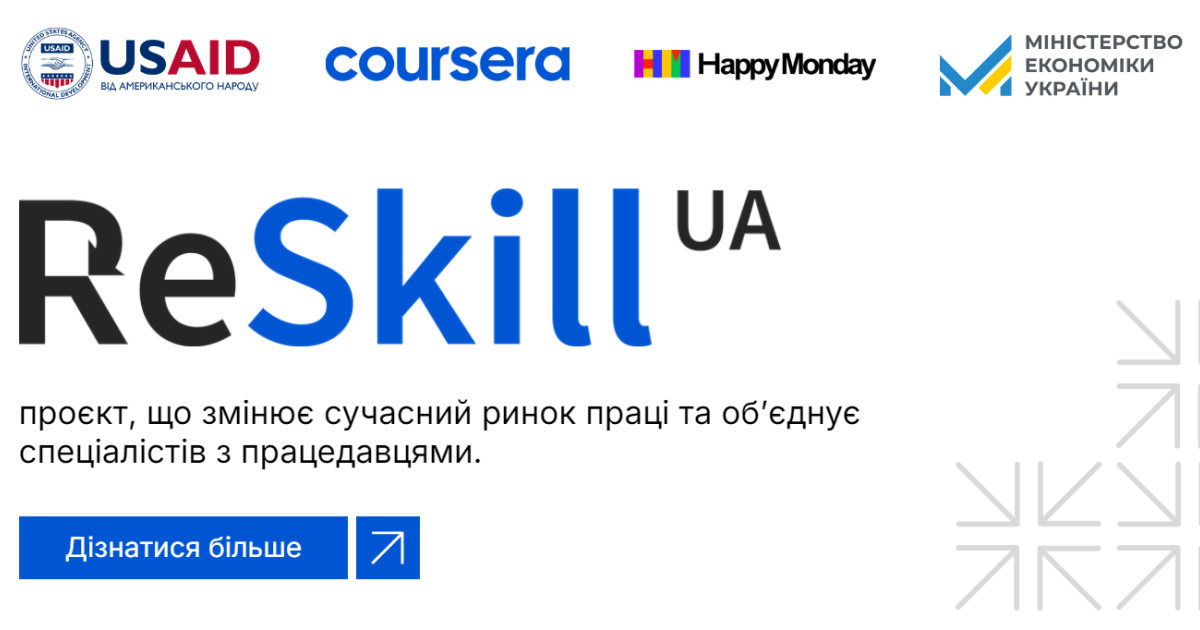 Проєкт ReSkill UA реалізується Coursera та Happy Monday за підтримки Програми USAID «Конкурентоспроможна економіка України» та сприяння Міністерства економіки України.