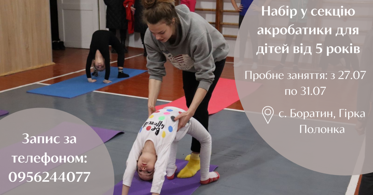 З 1 серпня оголошено набір у секцію акробатики, яка функціонуватиме у селах Боратин та Гірка Полонка. Запрошуються хлопці та дівчата від 5 років. Заняття проводимуться 2 рази на тиждень. На пробне заняття, яке відбудеться з 24 по 31 липня, можна записатися за телефоном 0956244077.