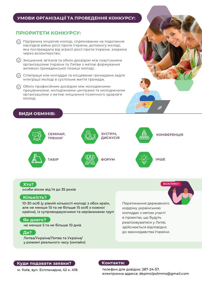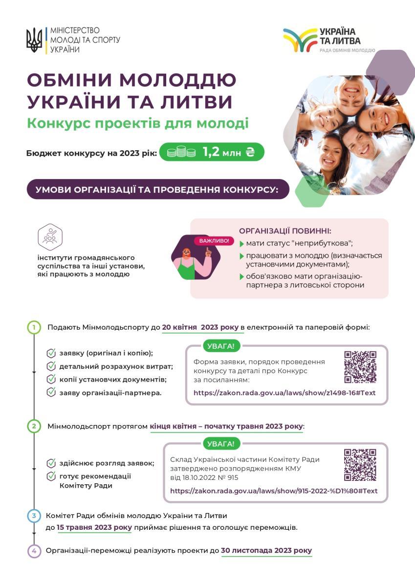Відповідно до Угоди між Урядом України та Урядом Литовської Республіки про Раду обмінів молоддю України та Литви, затвердженої постановою Кабінету Міністрів України від 9 грудня 2015 року № 1016, та Порядку здійснення обмінів молоддю України та Литви та проведення заходів відповідно до Угоди між Урядом України та Урядом Литовської Республіки про Раду обмінів молоддю України та Литви, затвердженого наказом Міністерства молоді та спорту від 16 листопада 2016 року № 4297, зареєстрованим в Міністерстві юстиції України від 18 листопада 2016 р. за № 1498/29628 (із змінами), Міністерство молоді та спорту України оголошує прийом заявок на участь у конкурсі на реалізацію проєктів у рамках здійснення обмінів молоддю України та Литви.