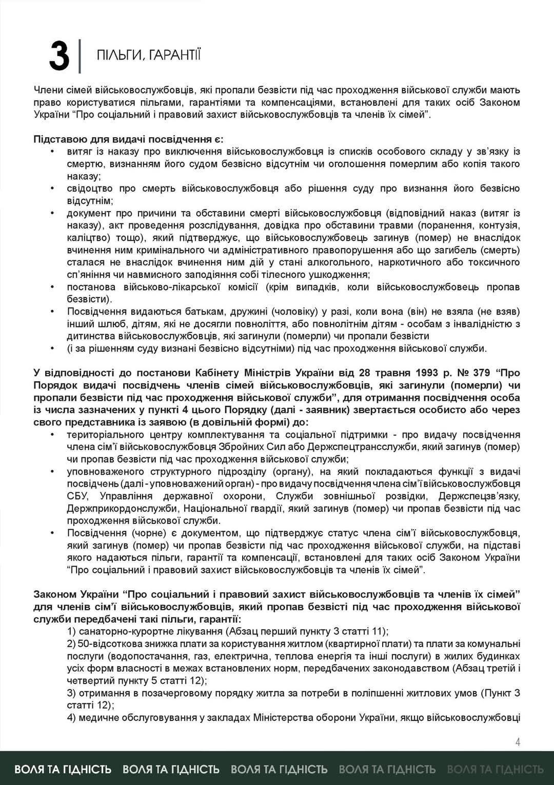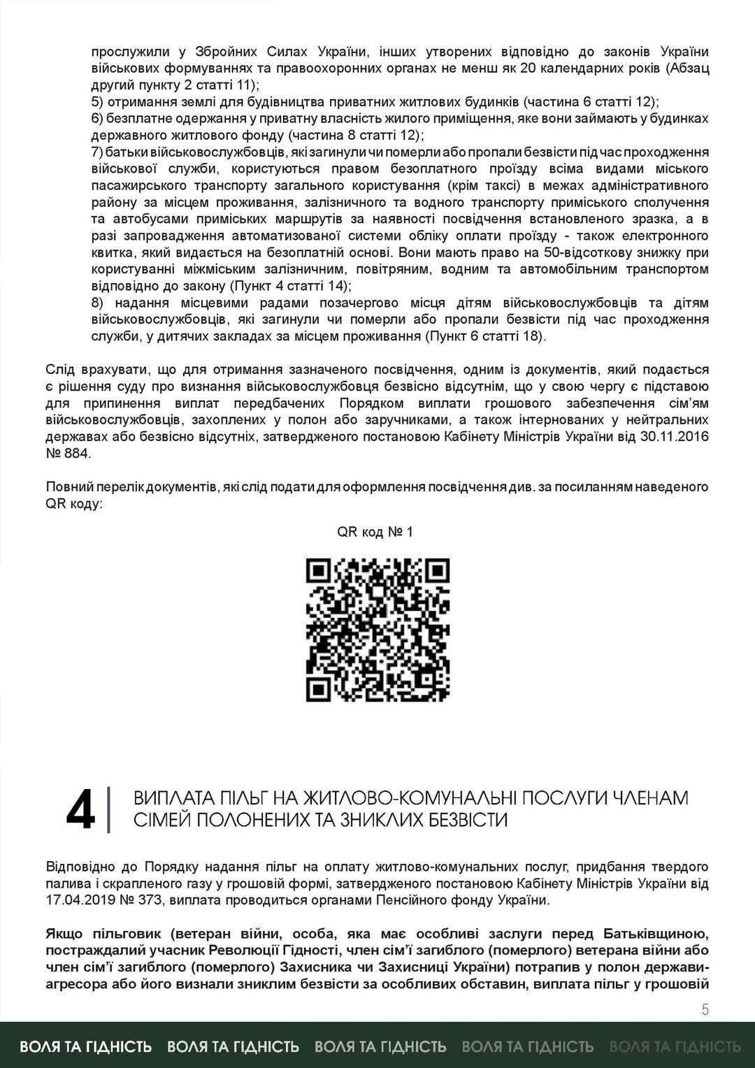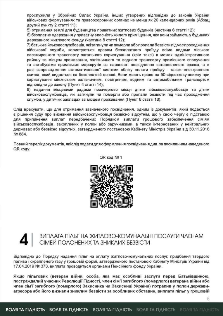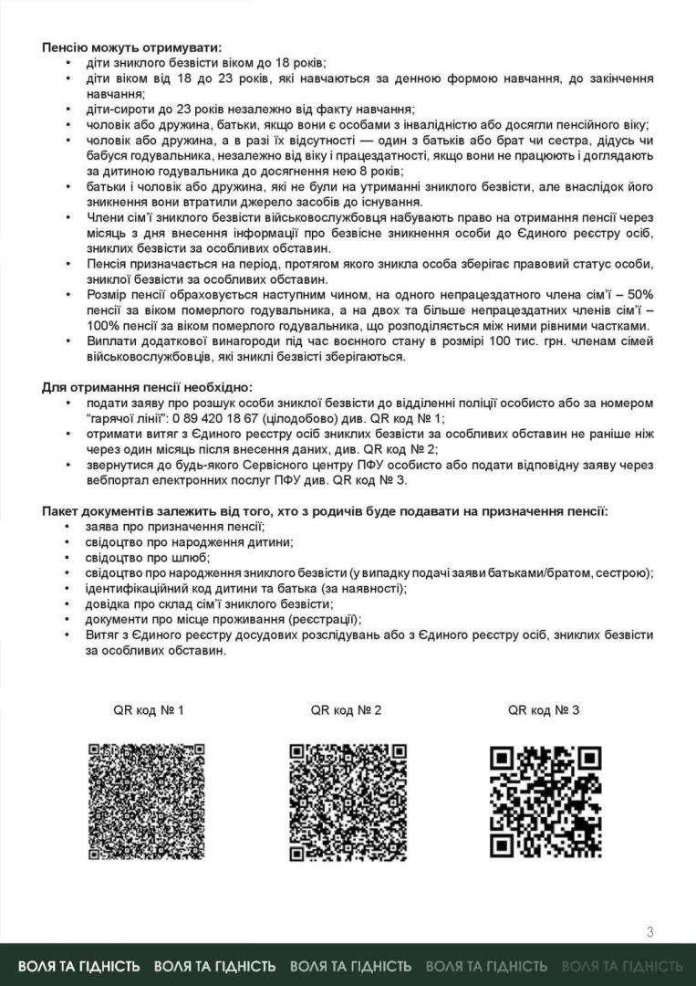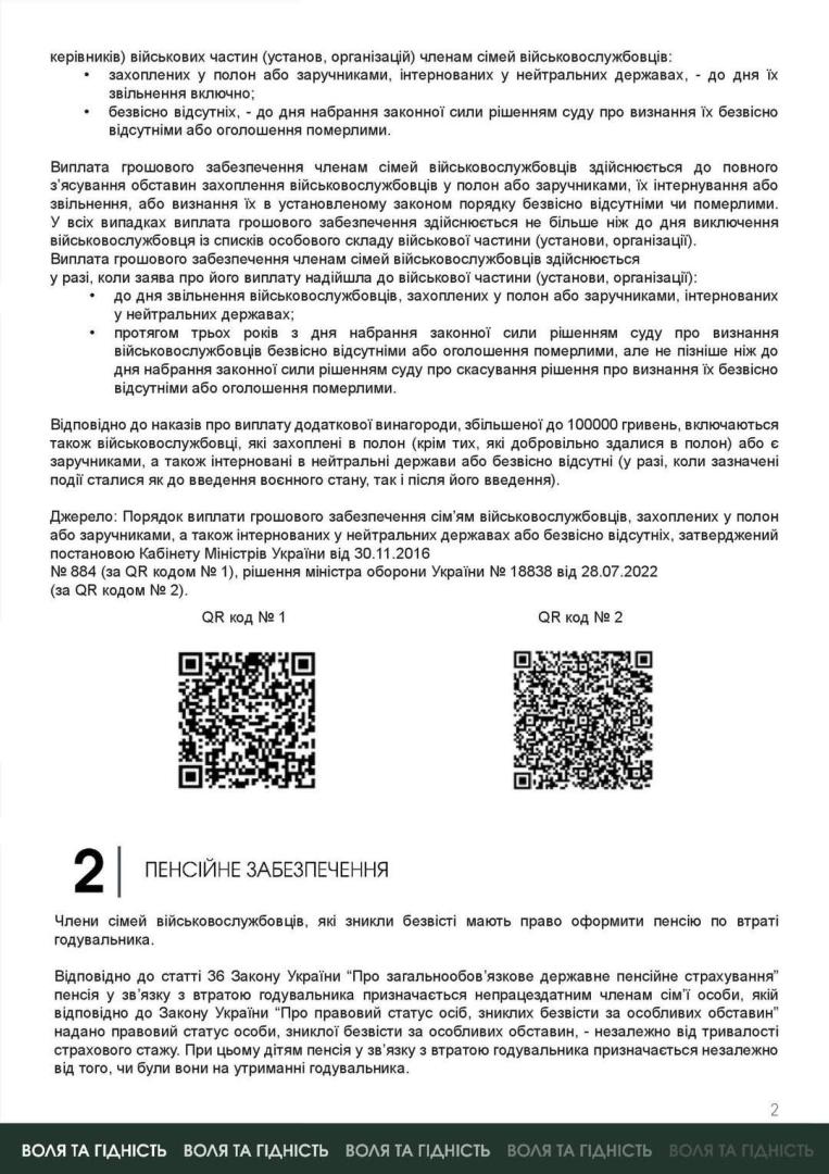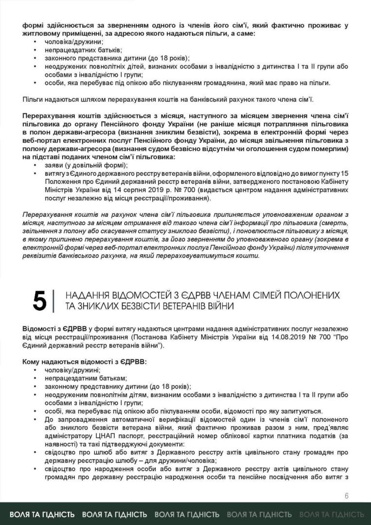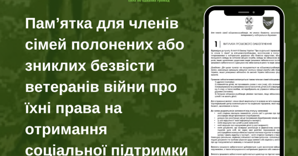 Мінветеранів підготувало інформаційну пам’ятку для членів сімей полонених або зниклих безвісти ветеранів війни про їхні права на отримання соціальної підтримки. У ній детально розповідається про пенсійне забезпечення, виплату грошового забезпечення, пільги на ЖКП та отримання витягу з ЄДРВВ.