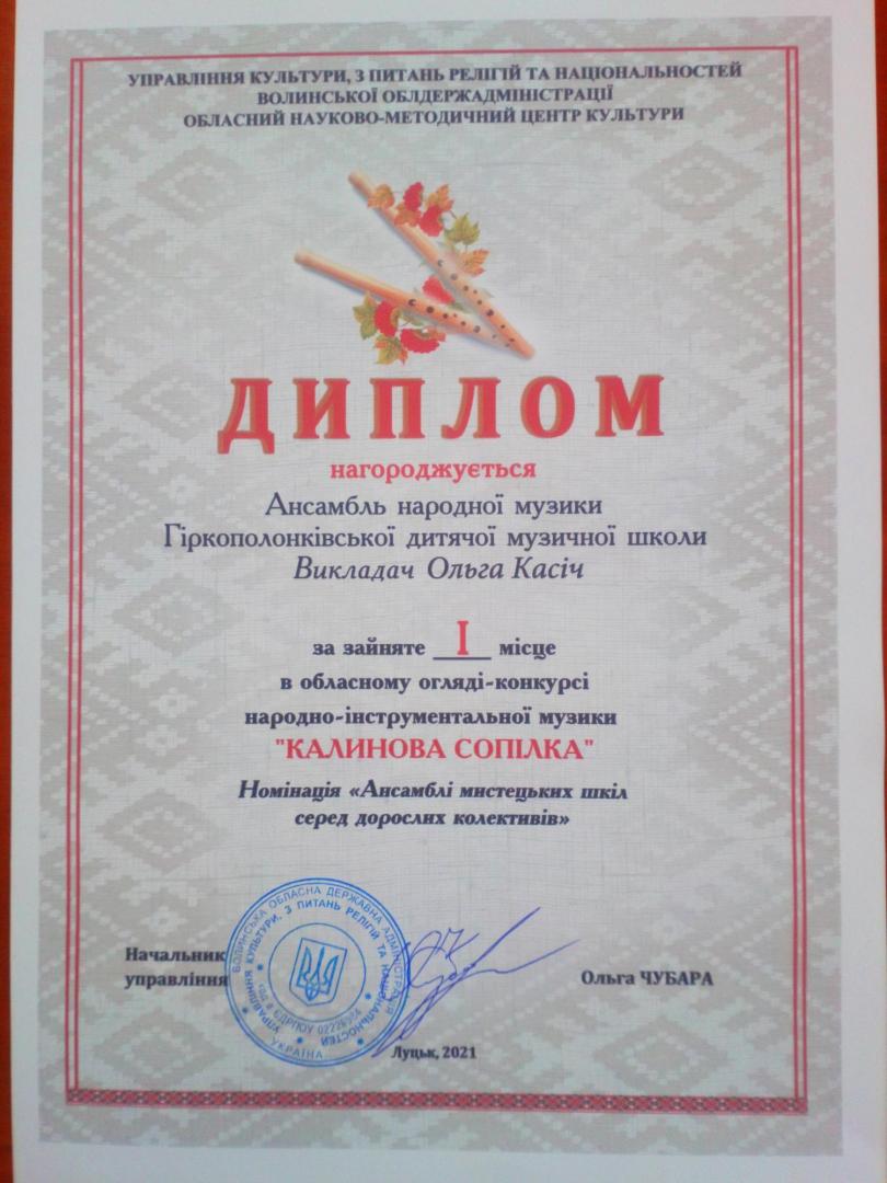 Вітаємо Ансамбль народної музики Гіркополонківської дитячої музичної школи та їх керівницю Ольгу Касіч. Натхнення та нових перемог!