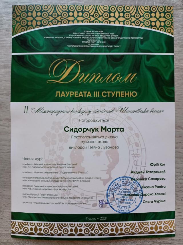 За рішенням журі участь у ІІ турі конкурсу продовжили 70 учасників, серед них і учениця Гіркополонківської дитячої музичної школи Марта Сидорук. Виступ нашої піаністки виявився вкрай вдалим, тож Марта стала лауреатом ІІІ премії (до речі, єдина учасниця-лауреат з сілської музичної школи).