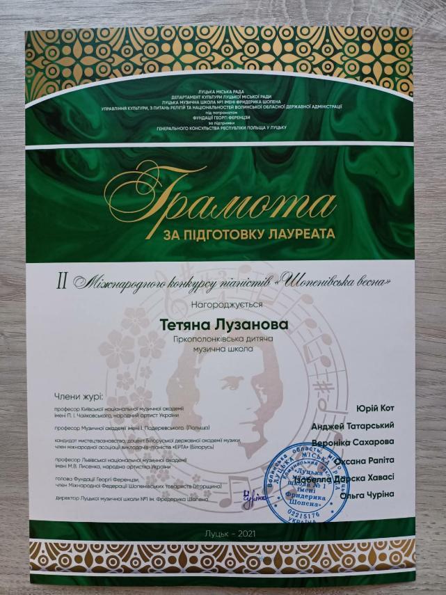 Нещодавно у Луцьку завершився ІІ Міжнародний конкурс піаністів «Шопенівська весна». Свою виконавську майстерність демонстрували 93 учасники з України, Литви, Білорусі, Польщі та Китаю. Україну представляли виконавці з Луцька та Волині, з Києва та Київщини, зі Львова та Львівщини, з Івано-Франківщини, Закарпаття, Кривого Рогу та області, з Черкас, Херсону, Харкова, Одеси, Маріуполя, Вінниці, Запоріжжя, Чернівців.