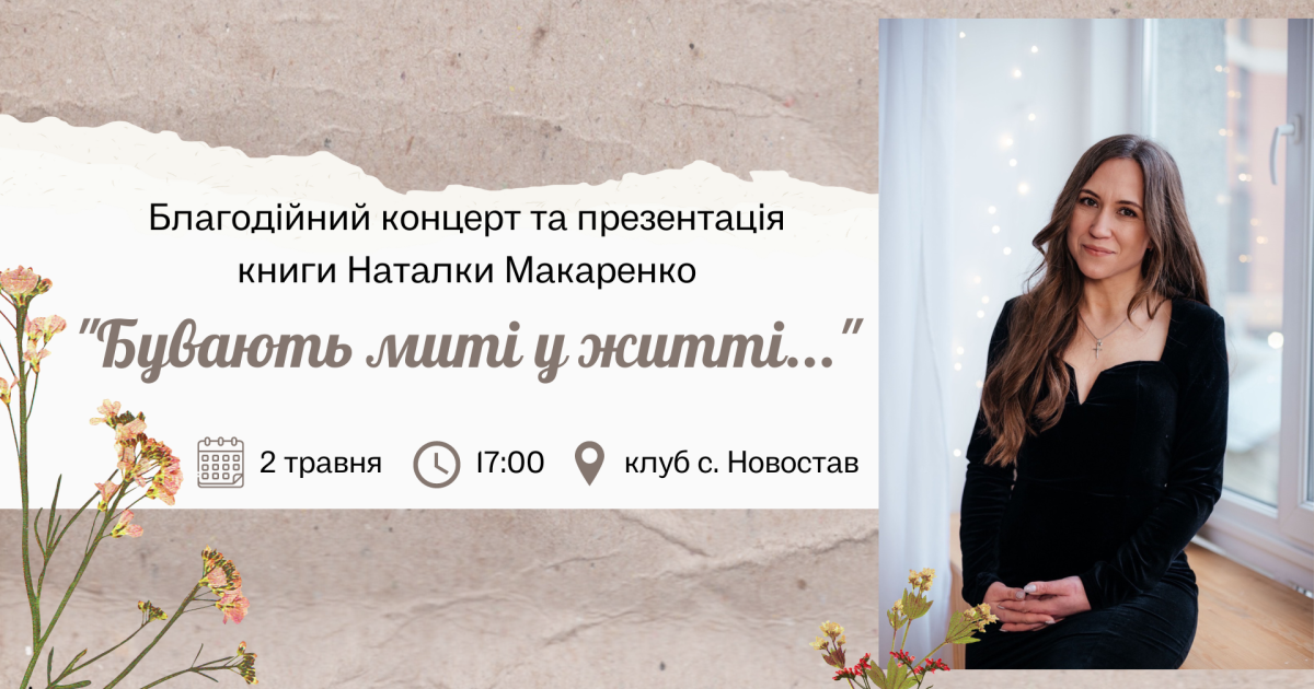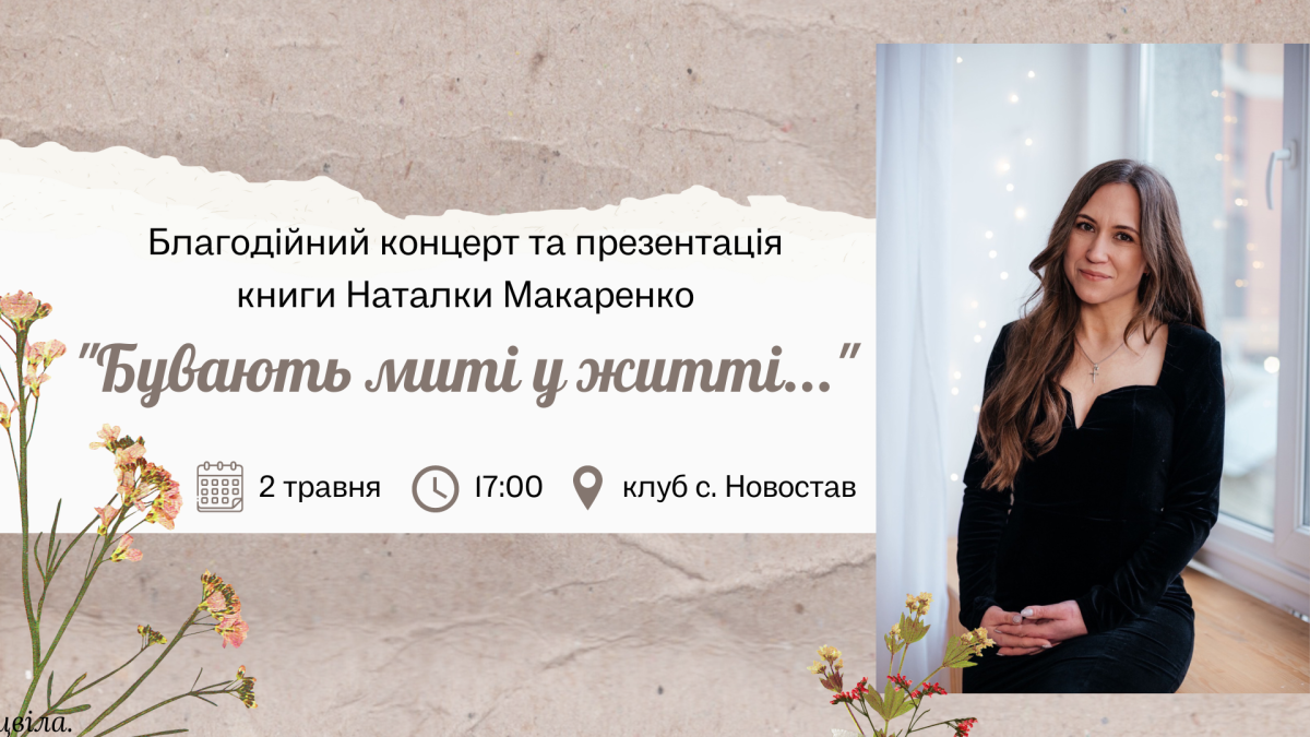 2 травня о 17:00 в клубі села Новостав відбудеться благодійний концерт та презентація книги Наталки Макаренко «Бувають миті у житті». Запрошуємо поціновувачів художнього слова розділити з авторкою цей чуттєвий момент та провести вечір у творчій атмосфері.