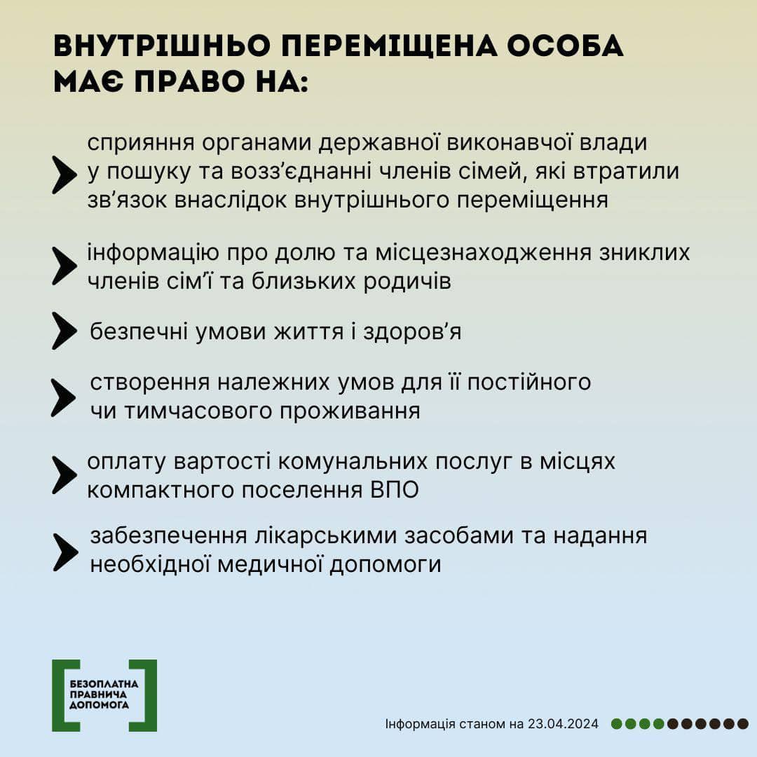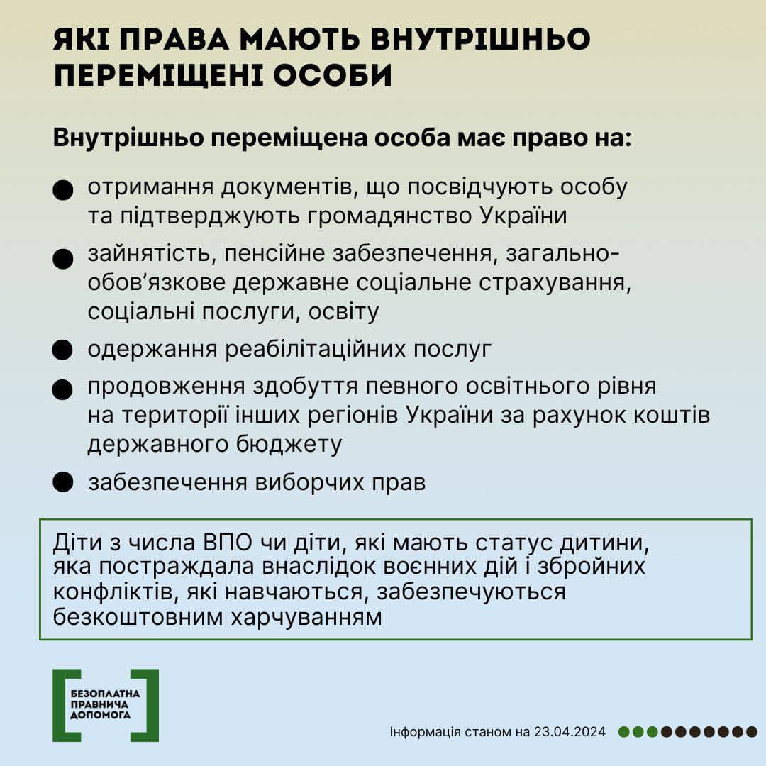 Внутрішньо переміщені особи користуються тими ж правами і свободами відповідно до Конституції, законів та міжнародних договорів України, як і інші громадяни. Детальна інформація про права ВПО у інфографіці від системи безоплатної правничої допомоги.