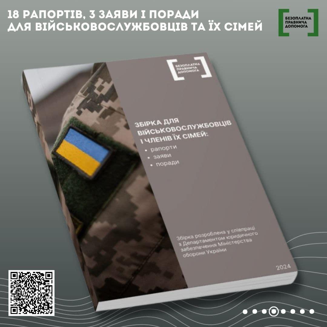 Збірка для військовослужбовців і членів їх родин доступна за посиланням: https://legalaid.gov.ua/publikatsiyi/zbirka-dlya-vijskovosluzhbovcziv-i-chleniv-yih-simej-raporty-zayavy-porady/