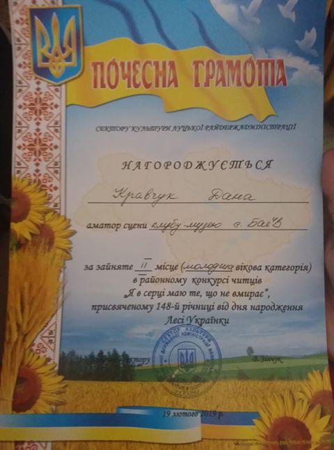 Приємно відзначити, що жительки нашої громади Дана Кравчук (село Баїв) та Оксана Надєїна (село Городище) вразили усіх проникливим та щирим виконанням віршів. Журі високо оцінили декламаторські здібності, артистизм та ліричне прочитання творів. За результатами конкурсу аматор сцени клубу-музею села Баїв Дана Кравчук здобула друге місце.