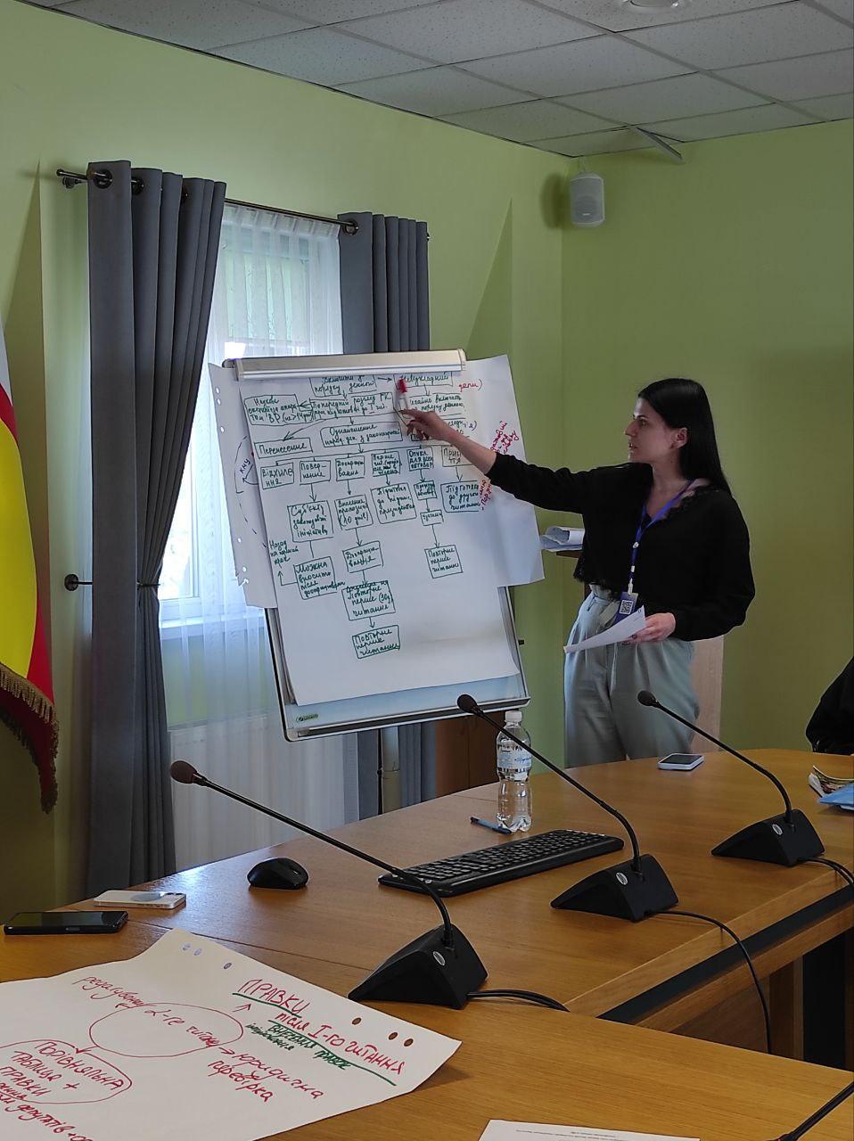 Анастасія Шишко, помічниця народної депутатки Ірини Констанкевич, поділилася практичними кейсами та розповіла про правові аспекти теми «Місцеве самоврядування і парламент: демократичне представництво та ефективна взаємодія в умовах воєнного стану», а також провела інтерактив «Світове кафе».