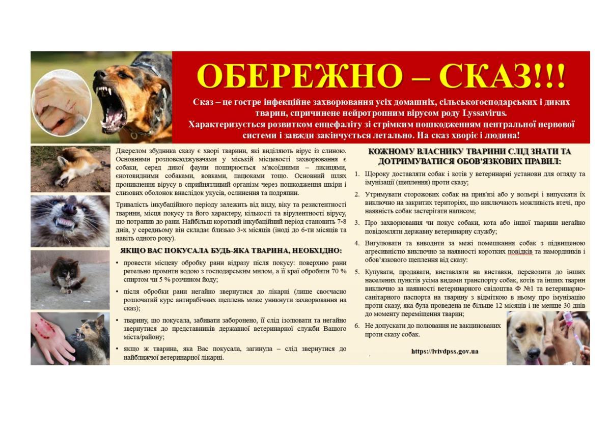 Луцький районний відділ ДУ «Волинський ОЦКПХ МОЗ» інформує про напружену епізоотичну ситуацію сказу серед тварин. Цього року від хвороби в Харківській області померла людина. За оцінками Всесвітньої організації охорони здоров’я, щорічно сказ є причиною майже 60 тисяч смертей у 150 країнах світу. Захворюванню можна запобігти, щорічно вакцинуючи свійських та домашніх тварин, уникаючи контактів із дикими тваринами та звертаючись по медичну допомогу відразу після потенційного зараження, до моменту появи перших клінічних симптомів.