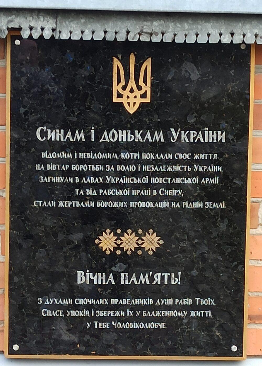 Про призначення пам’ятника свідчить надпис: «Синам і донькам України відомим і невідомим, котрі поклали своє життя на вівтар Української Незалежної Держави, загинули в лавах Української Повстанської Армії та від рабської праці в Сибіру, стали жертвами ворожих провокацій на рідній землі. Вічна пам’ять! З духами спочилих праведників душі рабів Твоїх, Спасе, упокій і збережи їх у блаженному житті, у Тебе Чоловіколюбче».