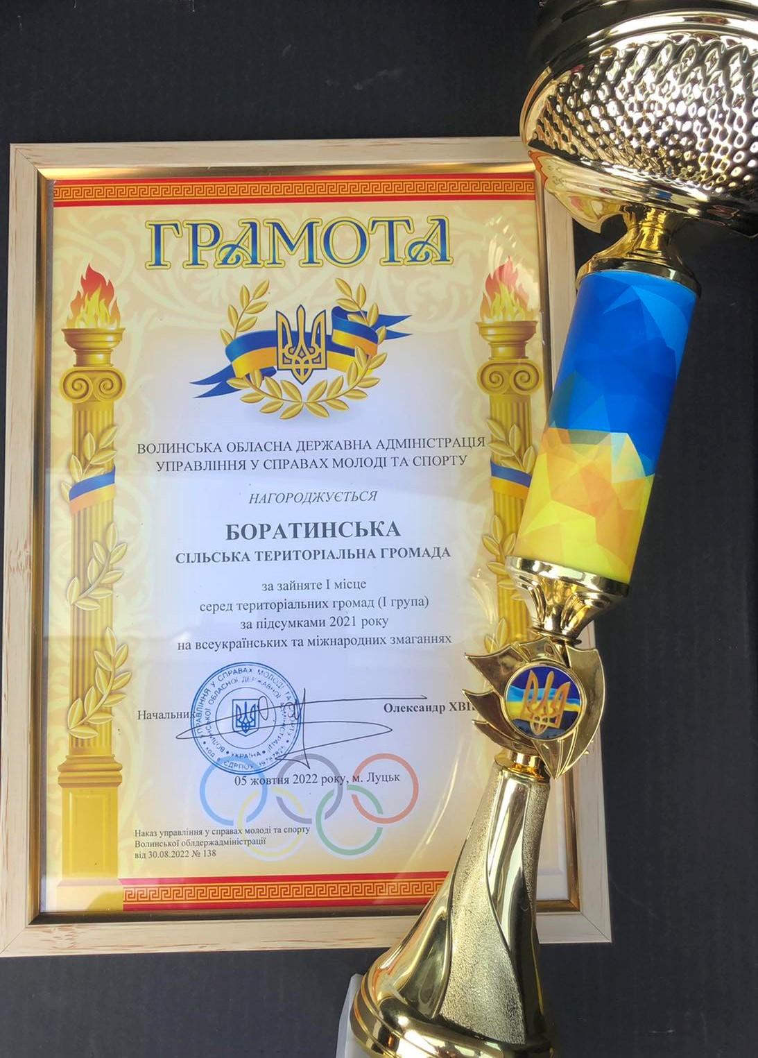 Здобутки наших спортсменів традиційно не залишилися поза увагою. Приємно відзначити, що Боратинська сільська територіальна громада посіла перше місце серед територіальних громад (I група) за підсумками 2021 року на всеукраїнських та міжнародних змаганнях.
