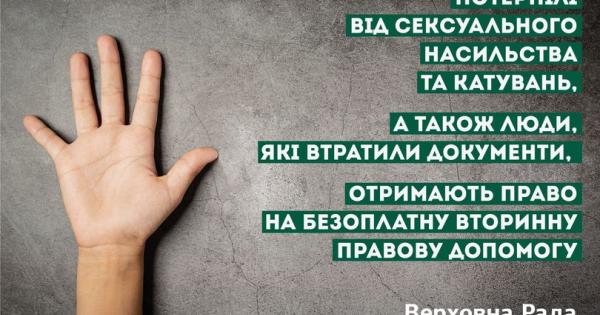 Зокрема, право на безоплатну вторинну правову допомогу отримають потерпілі від кримінальних правопорушень проти статевої свободи та статевої недоторканості, катування або жорстокого поводження під час воєнних дій чи збройного конфлікту. Відтепер ці особи зможуть звернутися до системи безоплатної правової допомоги та отримати послуги з представництва інтересів в судах, інших державних органах, органах місцевого самоврядування, перед іншими особами, а також складення документів процесуального характеру у кримінальних провадженнях, розпочатих за фактом вчинення таких кримінальних правопорушень. Також люди, які не мають документів, що посвідчують особу та підтверджують громадянство України, матимуть право отримати правові послуги з представництва інтересів в судах, інших державних органах, органах місцевого самоврядування, перед іншими особами, а також складення документів процесуального характеру з питань встановлення в судовому порядку фактів, що мають юридичне значення, пов’язаних з оформленням та видачею таких документів. Законопроєкт наразі направлено на підпис Президента України.