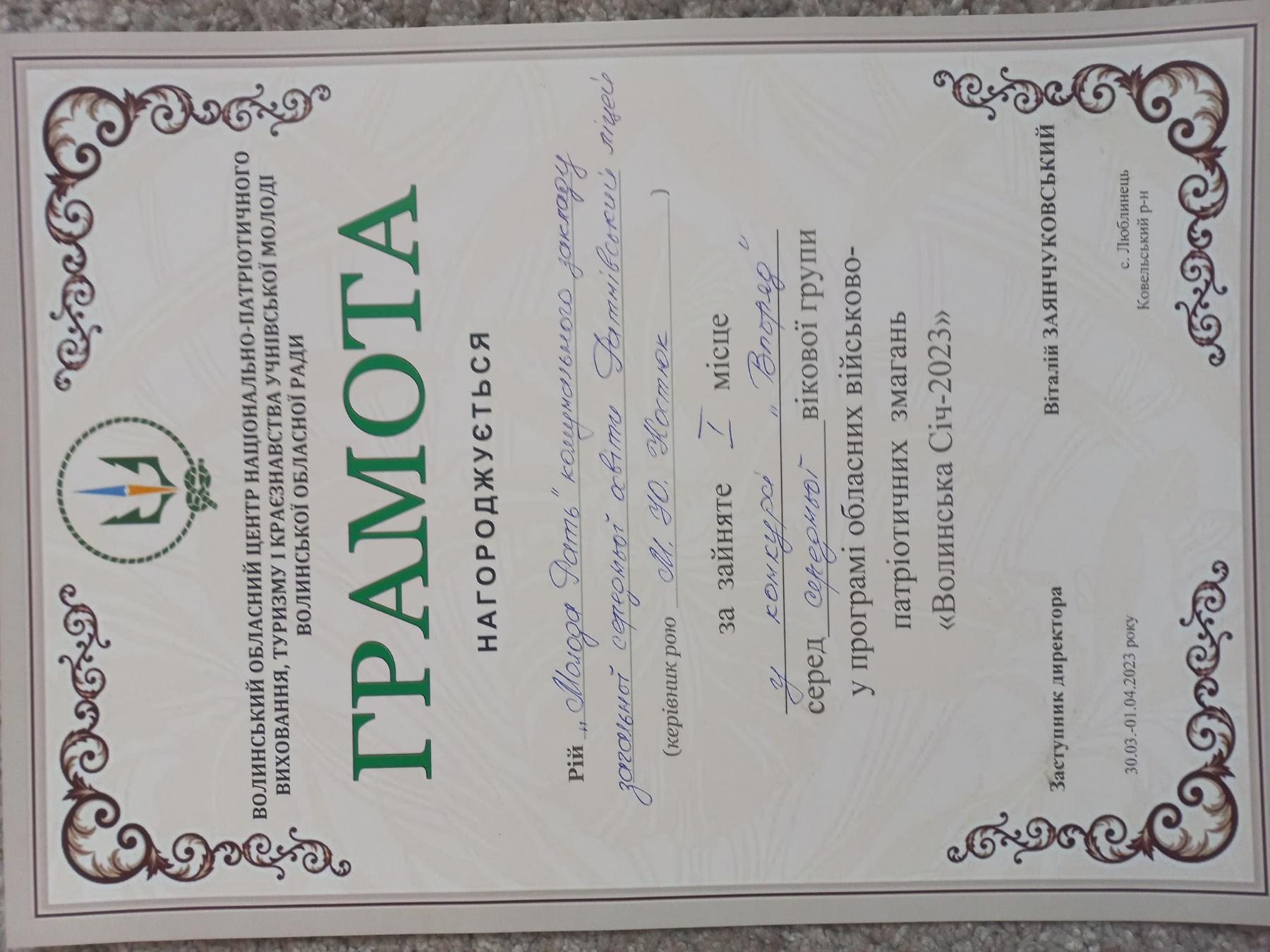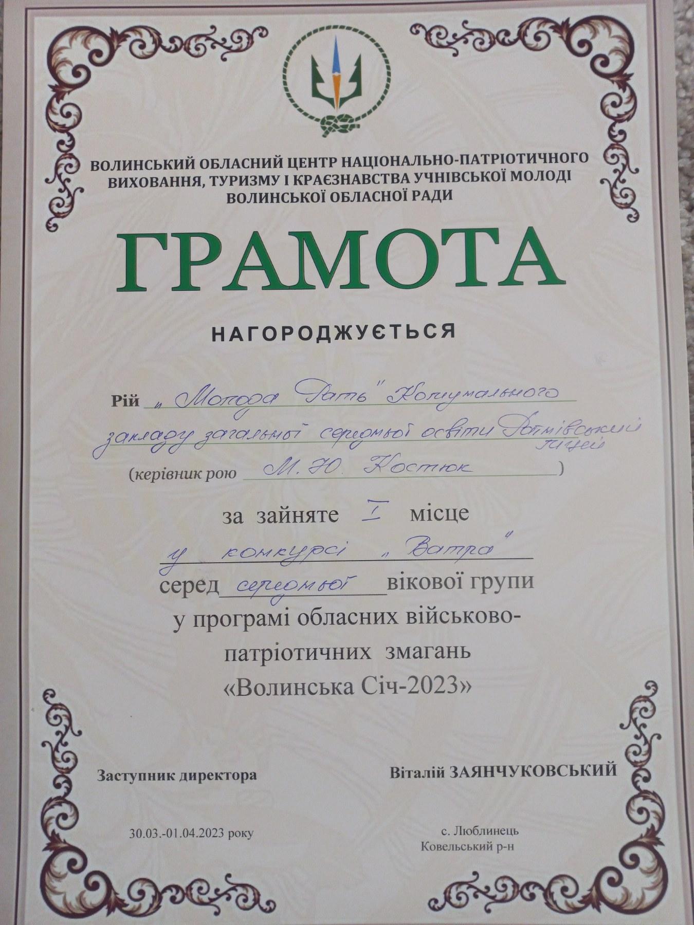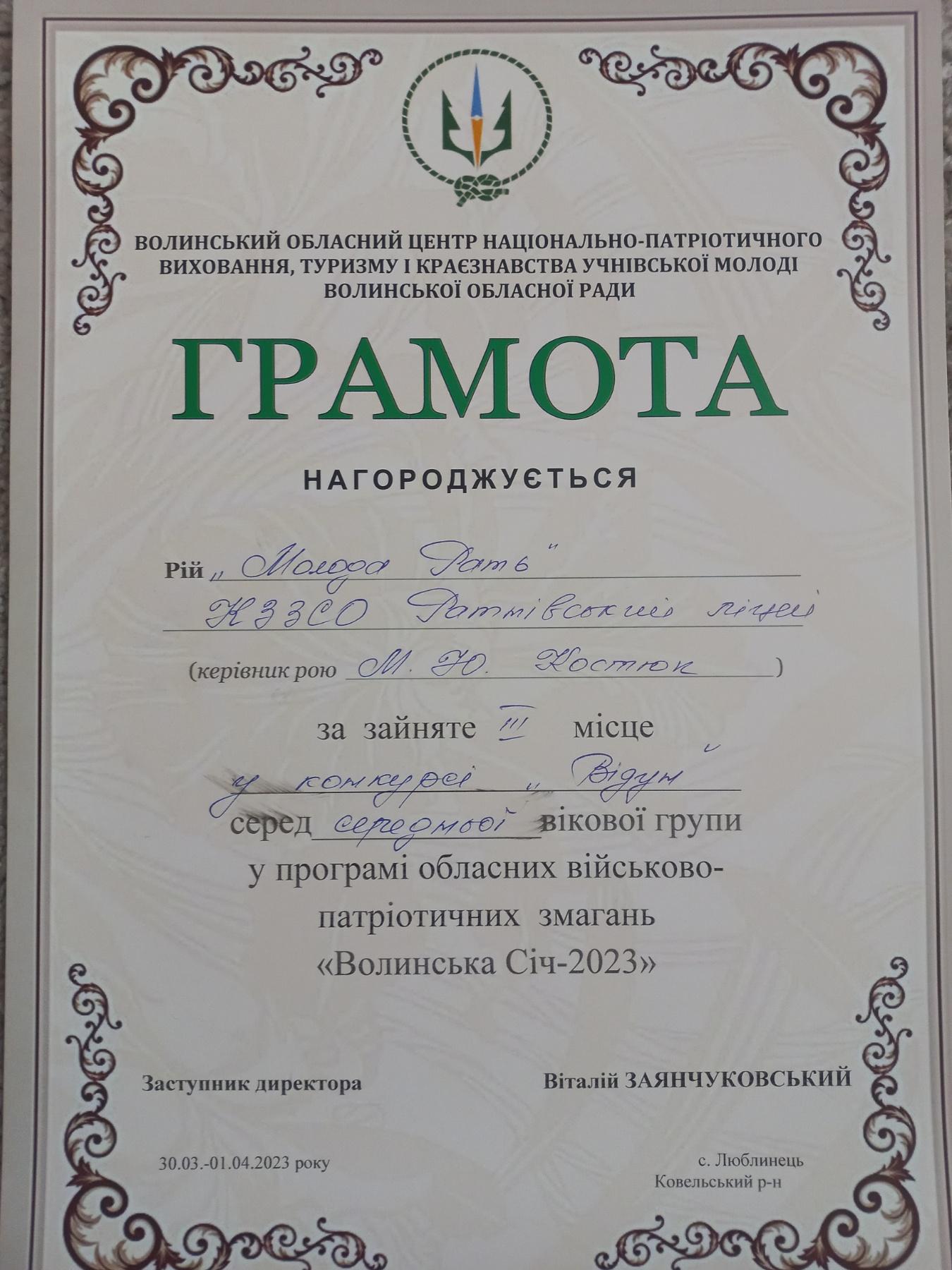 З 30 березня по 1 квітня у селі Люблинець Ковельського району проходили обласні військово-патріотичні змагання «Волинська Січ-2023». Боратинську громаду на даних змаганнях представив рій «Молода Рать» КЗЗСО «Ратнівський ліцей» у складі: Мартинюк Вікторії, Старчевського Олександра, Гайового Максима, Шевченка Владислава, Шумського Ореста, Миронюк Анастасії, Аліпова Станіслава, Лясковської Валерії та їхнього вихователя М.Ю. Костюк. Наші джури були активними учасниками різноманітних майстер-класів, організованих працівниками Центру національно-патріотичного виховання, туризму і краєзнавства, а також показали чудові результати у залікових видах гри «Сокіл» («Джура»):