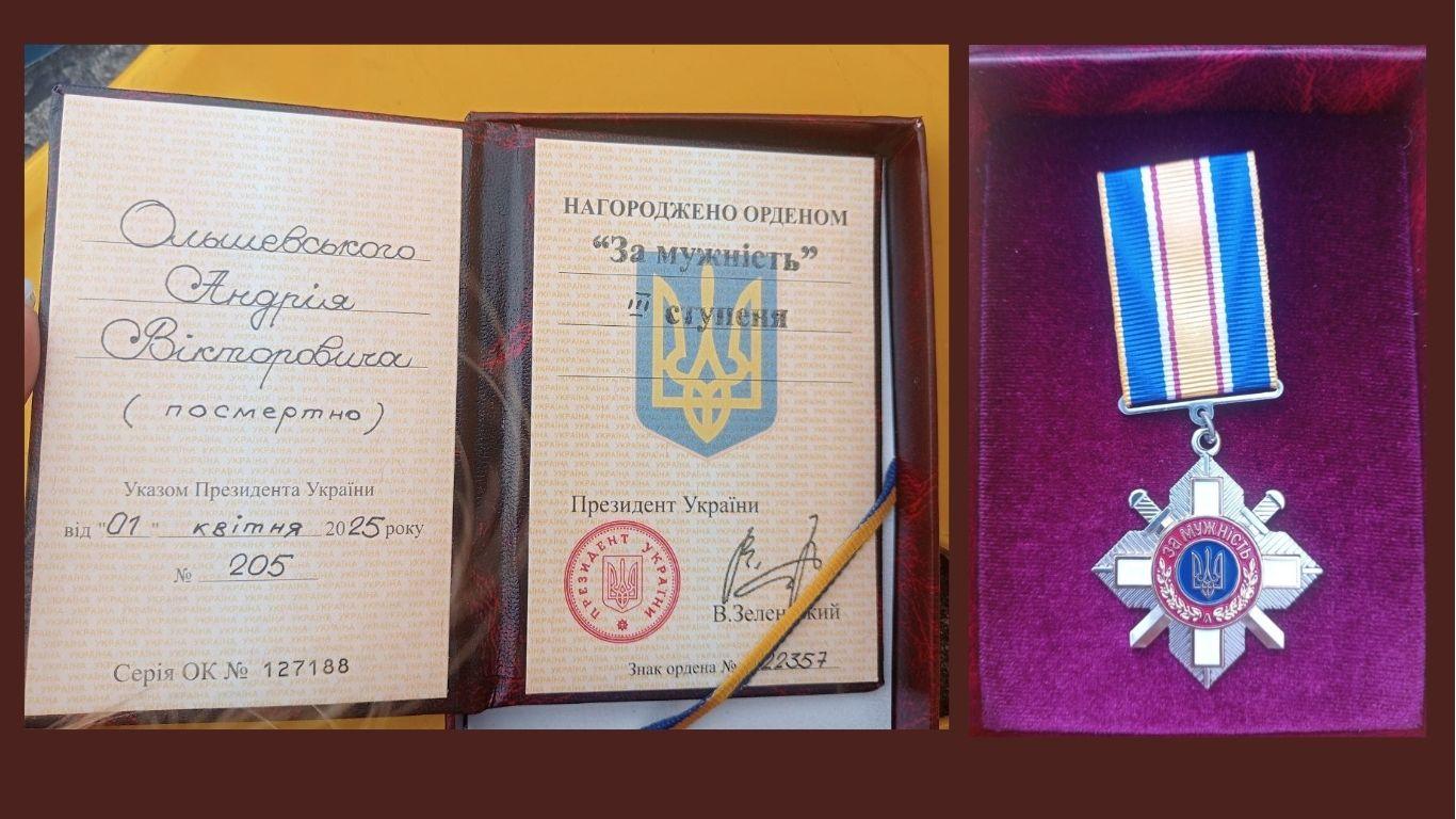 Указом президента України від 01 квітня 2025 року №205 нагороджено орденом за мужність ІІІ ступеня Ольшевського Андрія Вікторовича (посмертно).