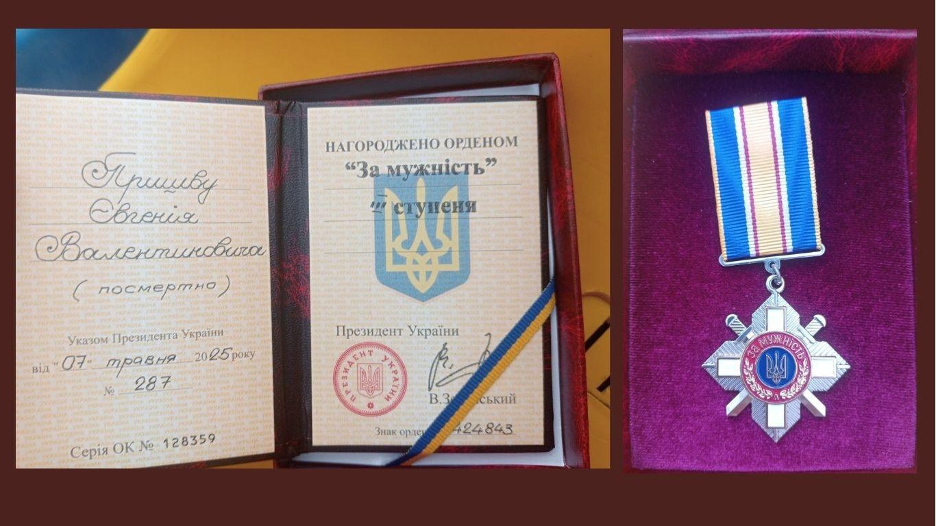 Указом президента України від 07 травня 2025 року №287 нагороджено орденом за мужність ІІІ ступеня Пришву Євгенія Валентиновича (посмертно).