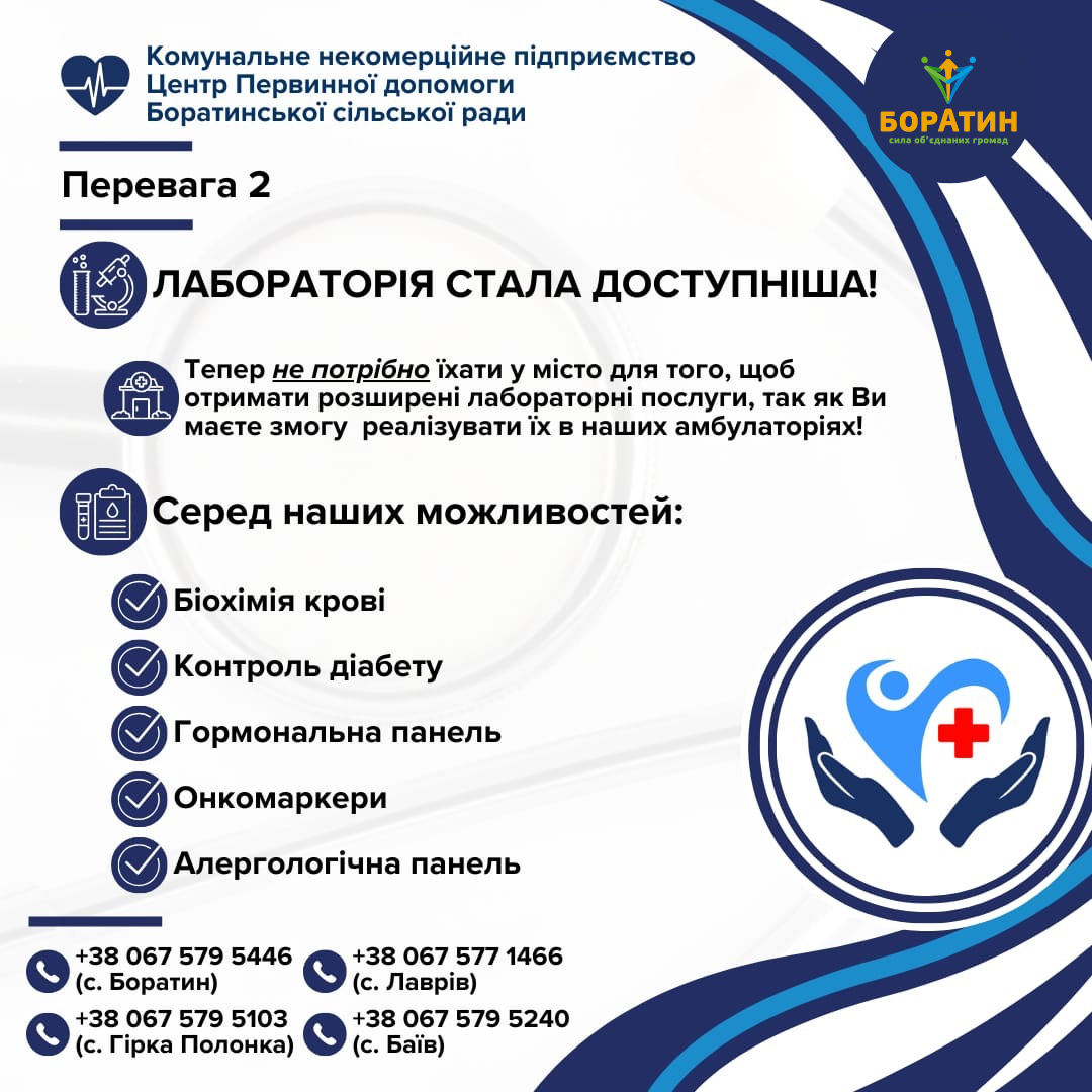 Продовжуємо ділитися з вами перевагами Центру первинної медико-санітарної допомоги Боратинської сільської ради, а саме можливістю отримати розширенні лабораторні послуги в наших амбулаторіях!