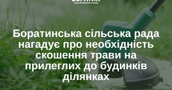 Боратинська сільська рада повідомляє усі підприємства, установи, організації, комунальні підприємства, заклади громадського харчування, навчальні, торгові та комерційні заклади, власників приватних домогосподарств про необхідність скошення трави на закріплених за ними територіях громади. Також нагадуємо про необхідність виконання робіт із прибиранню території від сміття, видалення порослі та кущів.