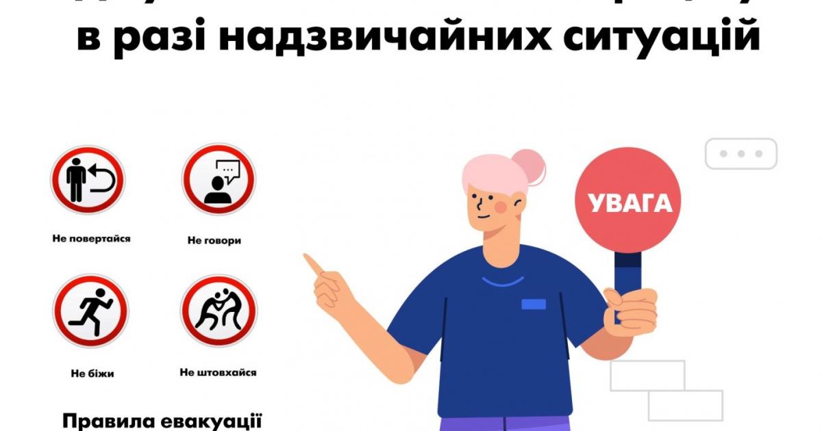 - Нагадайте дітям про головну мету евакуації: їхня безпека та правила евакуації: не біжи, не штовхайся, не повертайся.