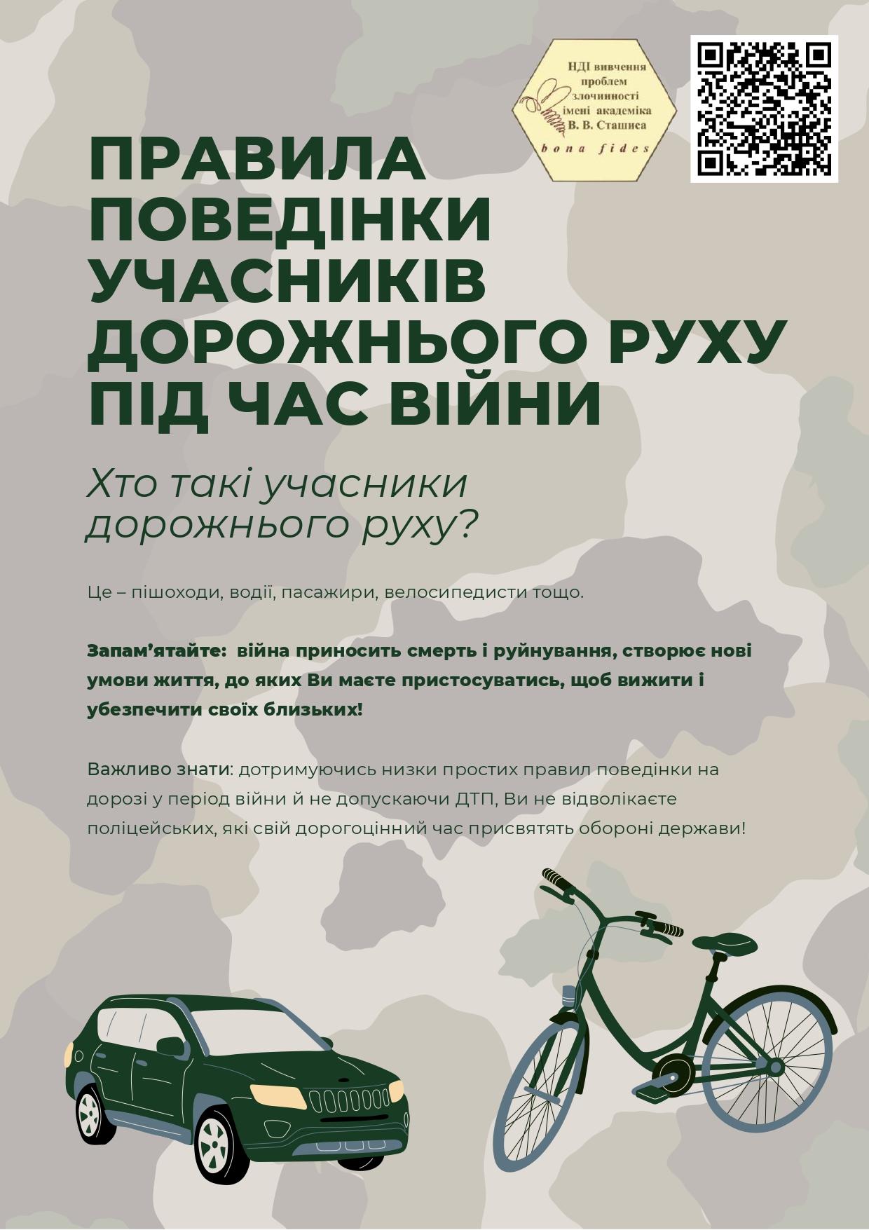 Враховуючи вразливість учасників дорожнього руху у період воєнного стану, вимушену необхiднiсть мiльйонів громадян України у переміщенні на автомобільному та іншому транспорті на значні відстані територією держави науковцями НДІ ВПЗ було розроблено Пам’ятку «Правила поведінки учасників дорожнього руху під час війни». У ній міститься низка важливих і соціально корисних порад, здатних зберегти життя i знизити ризики для знищення майна громадян.