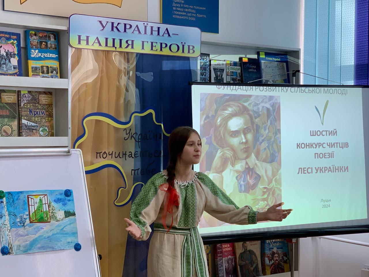 За сприяння та фінансової підтримки ГО «Фундація розвитку сільської молоді» відбувся VI конкурс читців поезії Лесі Українки. В конкурсі брали участь діти 1-11 класів сільських шкіл у двох вікових категоріях – 7-11 років та 12-16 років. Цей щорічний конкурс, покликаний вшанувати культурну спадщину видатної поетеси Лесі Українки, є дітищем засновників ГО «Фундація розвитку сільської молоді» Яни Цапук та Володимира Цапука, які, до слова, є жителями села Мстишин Боратинської громади.