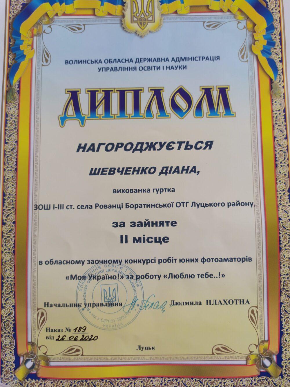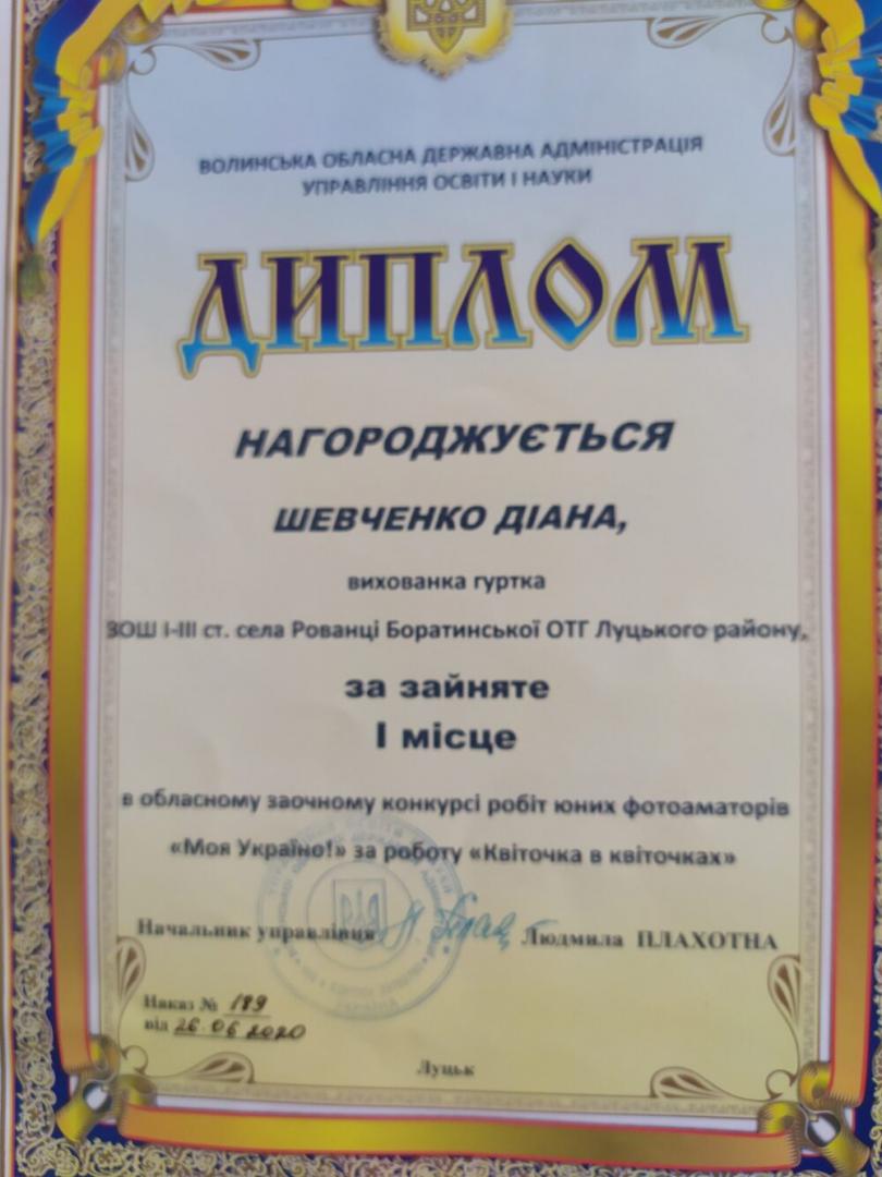 Шестикласниця Діана Шевченко стала переможницею обласного конкурсу юних фотоаматорів «Моя Україно!». Дві роботи школярки – «Квіточка в квіточках» та «Люблю тебе…!» були визнані кращими та отримали відповідно I та II місце.