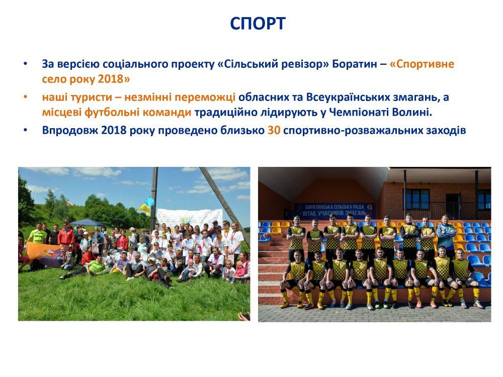 Відбулося чергове засідання сесії Боратинської сільської ради, на якому сільський голова Сергій Яручик прозвітував про роботу у 2018 році. У своєму виступі Сергій Олександрович розповів про результати роботи у всіх сферах соціально-економічного розвитку таких як освіта, соціальна сфера, медицина, комунальна сфера та розвиток інфраструктури, культура, спорт, промоція. Також сільський голова акцентував увагу на тенденціях економічного розвитку громади, проінформував щодо стану виконання сільського бюджету та зупинився на інших, не менш важливих, питаннях життєдіяльності громади. Не залишилися без уваги плани та стратегічні цілі на 2019 рік, про які також йшлося у звіті.