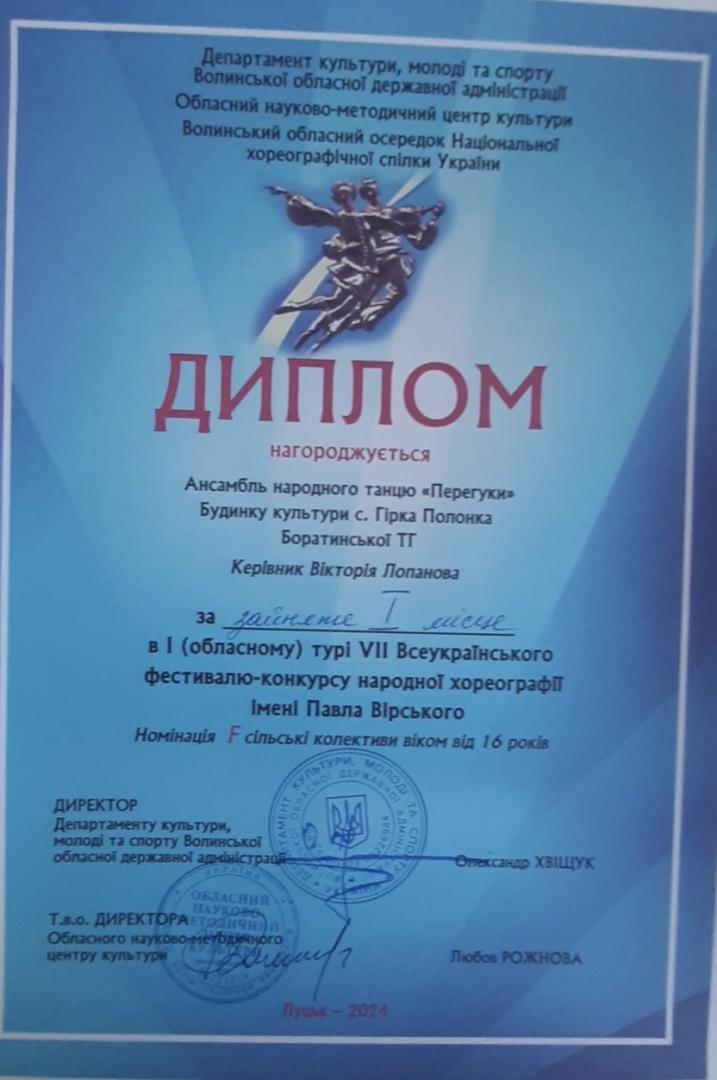 1 місце на ньому посіли танцюристи ансамблю народного танцю «Перегуки» Будинку культури села Гірка Полонка. Журі вразила хореографічна майстерність представників Боратинської громади. Перемогу вони отримали за виконання двох танців – «Притупи» та грузинського «Джерело».