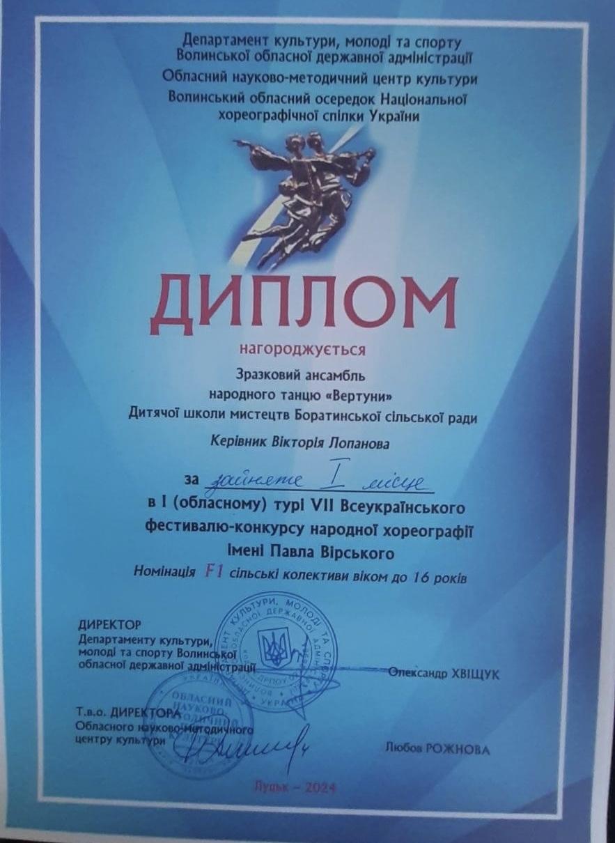 Також переможцями у своїй номінації стали вихованці зразкового ансамблю народного танцю «Вертуни» (учні V класу хореографічного відділення) Дитячої школи мистецтв Боратинської сільської ради.