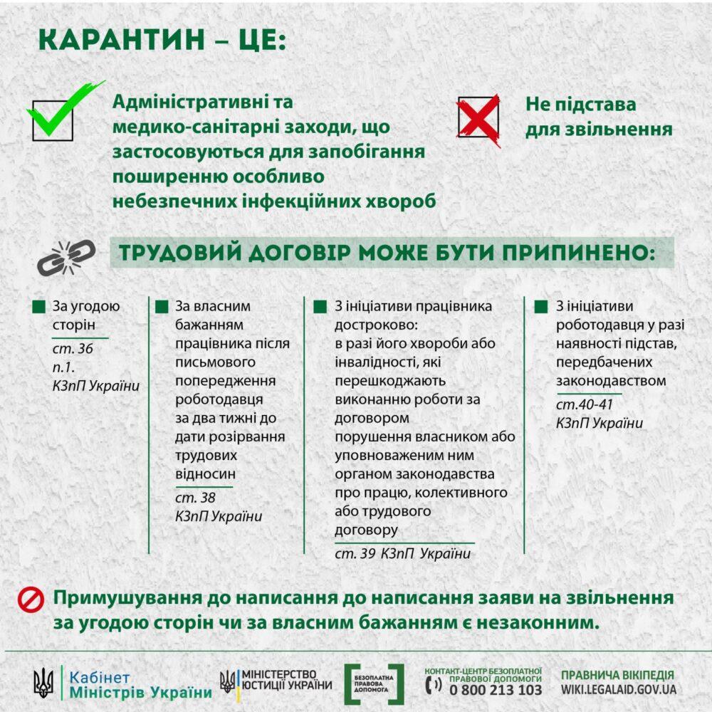 Карантин – це адміністративні та медико-санітарні заходи, що застосовуються для запобігання поширенню особливо небезпечних інфекційних хвороб (ст.1 Закону України «Про захист населення від інфекційних хвороб»), а не підстава для звільнення.