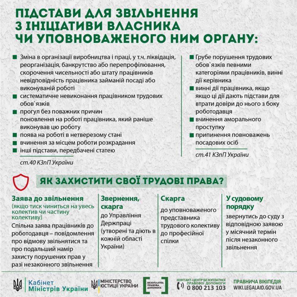 Незалежно від введення карантинних обмежень трудовий договір може бути розірваний за ініціативи роботодавця. Звільняти працівників у період карантину роботодавець може без ризику бути притягнутим до відповідальності, якщо таке звільнення є законним (на підставах, зазначених у ст.40 КЗпП України). У випадках, наприклад, змін в організації праці, у тому числі ліквідації, реорганізації підприємства, скорочення чисельності або штату працівників, виявленої невідповідності працівника займаній посаді внаслідок недостатньої кваліфікації, прогулу чи систематичного невиконання обов`язків без поважних причин та інших підстав.