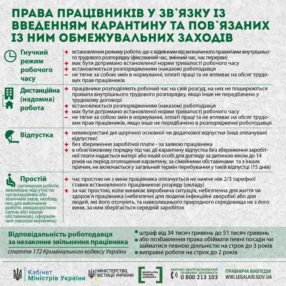 Відповідальність за незаконне звільнення працівника передбачена законодавством України, проте вона не має прямого зв`язку із запровадженням карантинних заходів. Так, роботодавцям-правопорушникам може загрожувати штраф від 34 тисяч гривень до 51 тисяч гривень або позбавленням права обіймати певні посади чи займатися певною діяльністю на строк до трьох років, або виправними роботами на строк до двох років.