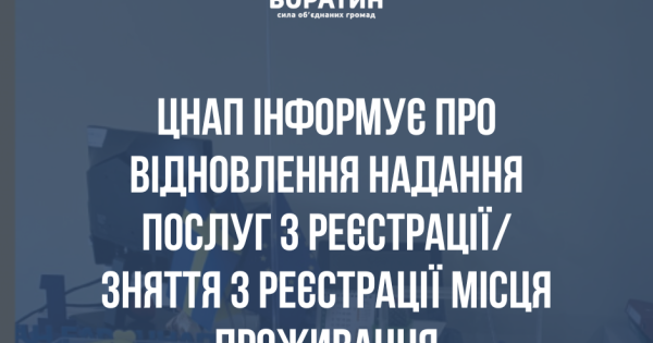 Центр надання адміністративних послуг Боратинської сільської ради інформує, що після технічних труднощів, спричинених кібератакою з боку рф, відновлено надання послуг у сфері реєстрації місця проживання.