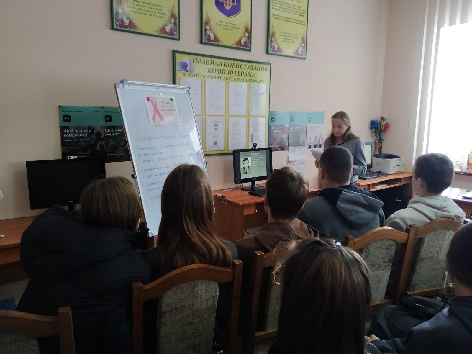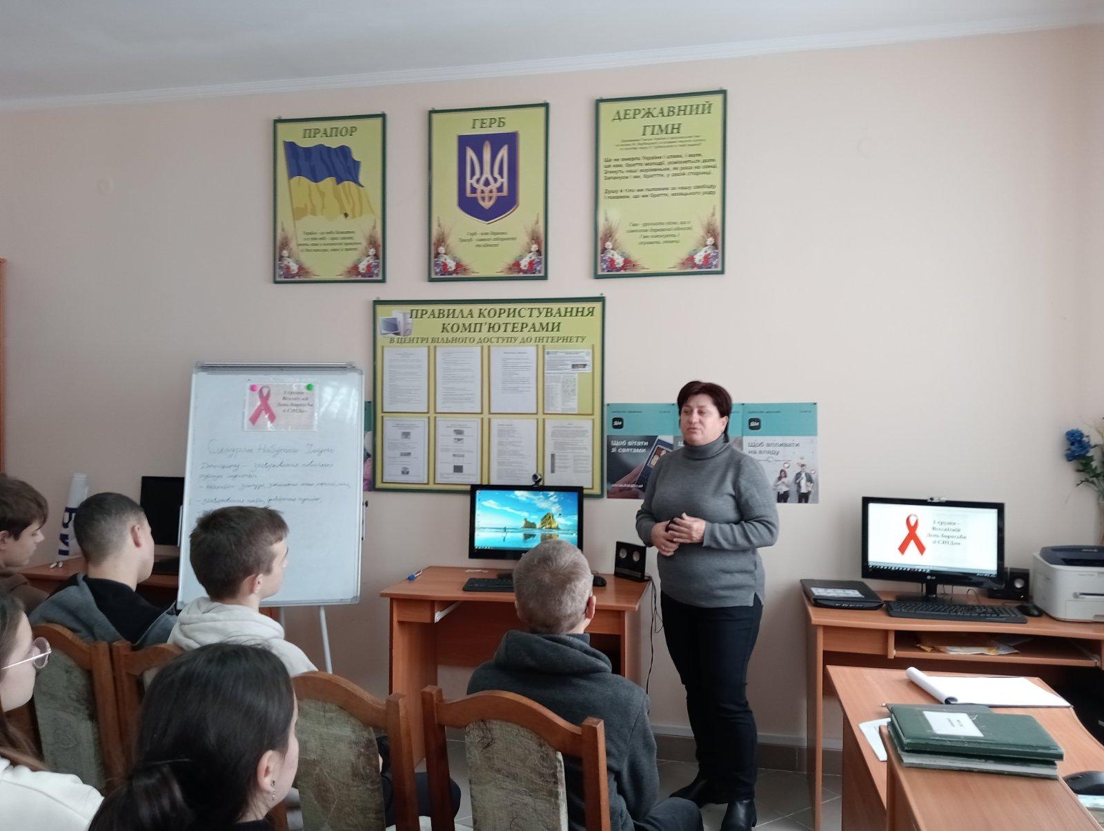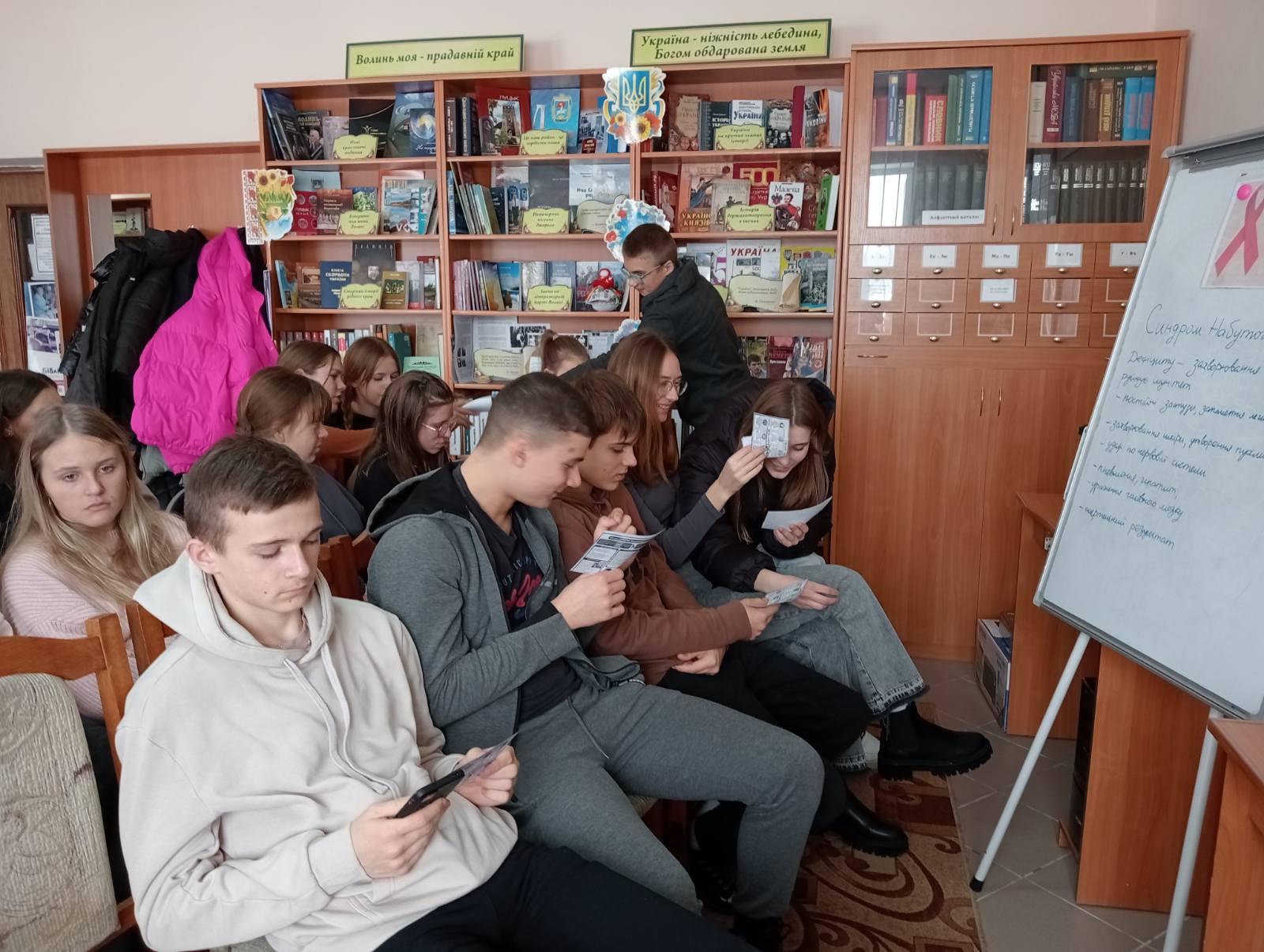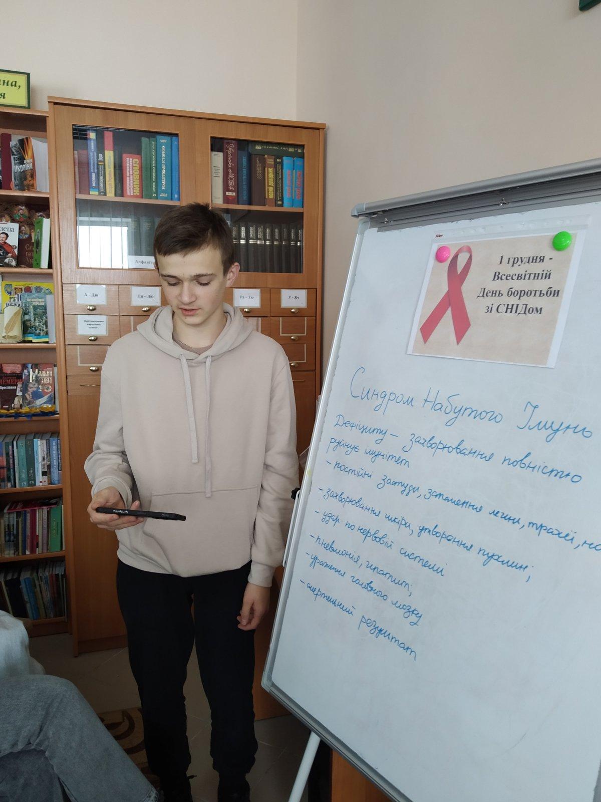 1 грудня у всьому світі відзначається Всесвітній день боротьби зі СНІДом. Головна мета – звернути увагу суспільства на цю проблему, адже це важлива нагода для підняття поінформованості молоді, широких верств населення про ВІЛ/СНІД. У бібліотеці с. Боратин з цієї нагоди відбувся урок-застереження «Молодь проти СНІДу» для учнів 10-го класу Боратинського ліцею. Урок провела бібліотекарка Руслана Фурман і класна керівниця Наталія Черняк. Бібліотекарка у вступному слові розповіла історію відкриття захворювання ВІЛ/СНІД, про символ – Червону стрічку, яка символізує надію на майбутнє без СНІДу.