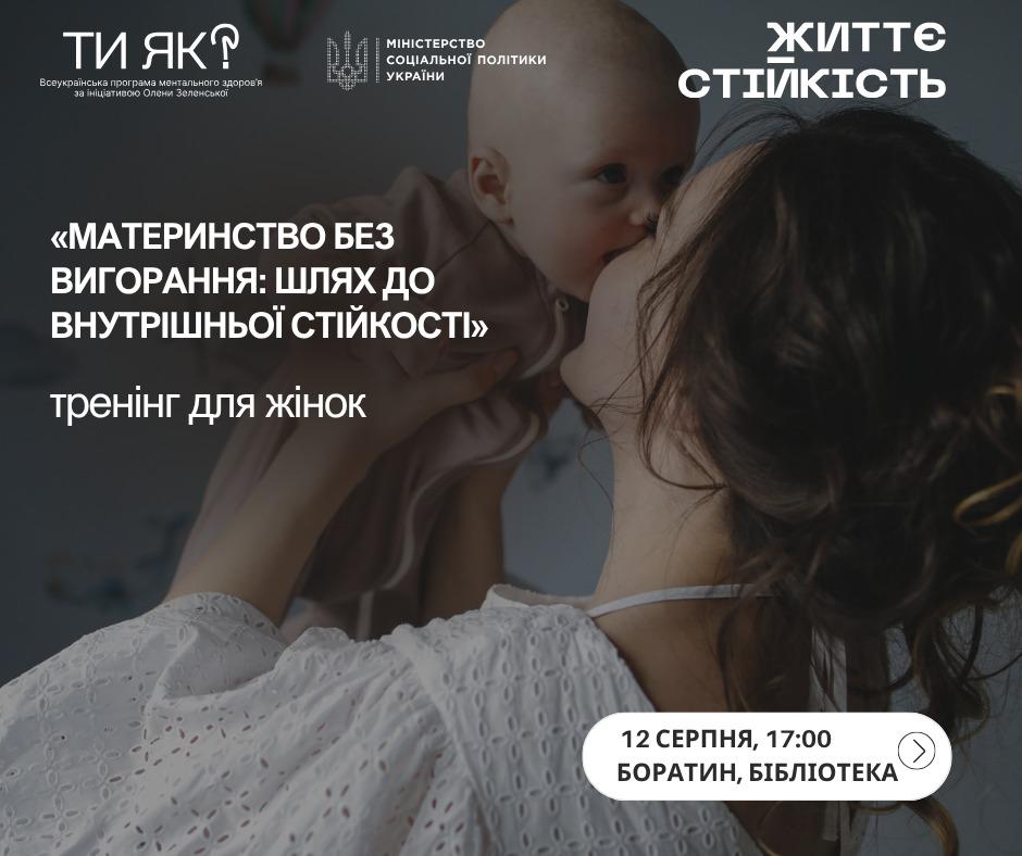 12 серпня о 17:00 у бібліотеці села Боратин фахівці Центру життєстійкості Боратинської громади проведуть тренінг для жінок на тему: «Материнство без вигорання: шлях до внутрішньої стійкості»