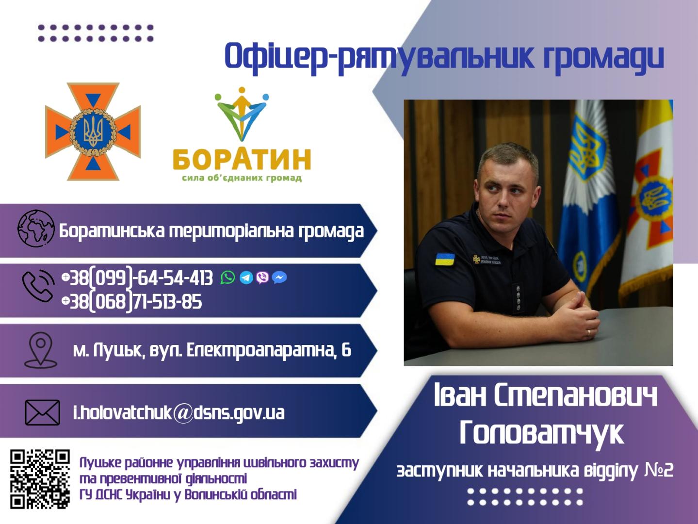 Офіцером-рятувальником Боратинської територіальної громади є Головатчук Іван Степанович - заступник начальника відділу 2 Луцького районного управління цивільного захисту та превентивної діяльності Головного управління ДСНС України у Волинській області.