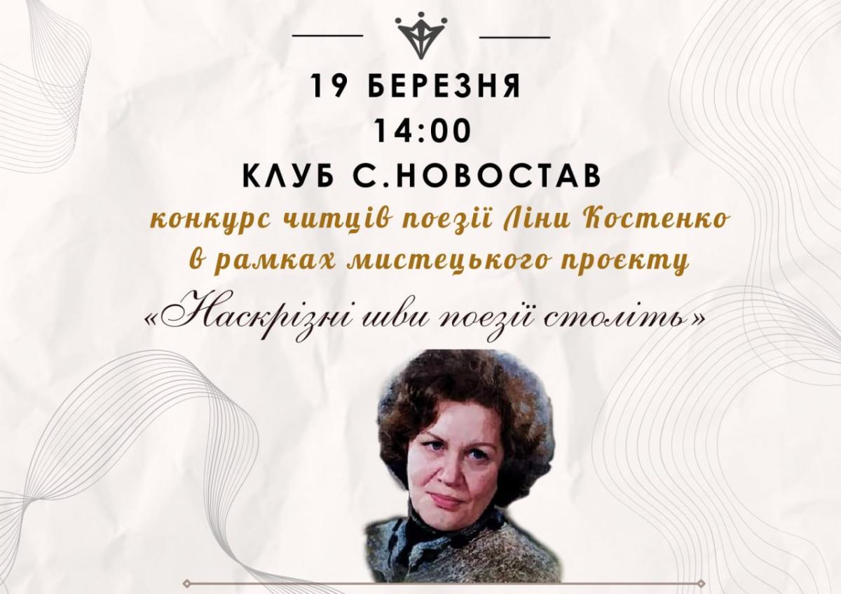 19 березня у клубі села Новостав відбудеться конкурс читців поезії Ліни Костенко. Захід проходитиме в рамках мистецького проєкту «Наскрізні шви поезії століть». Початок о 14:00.