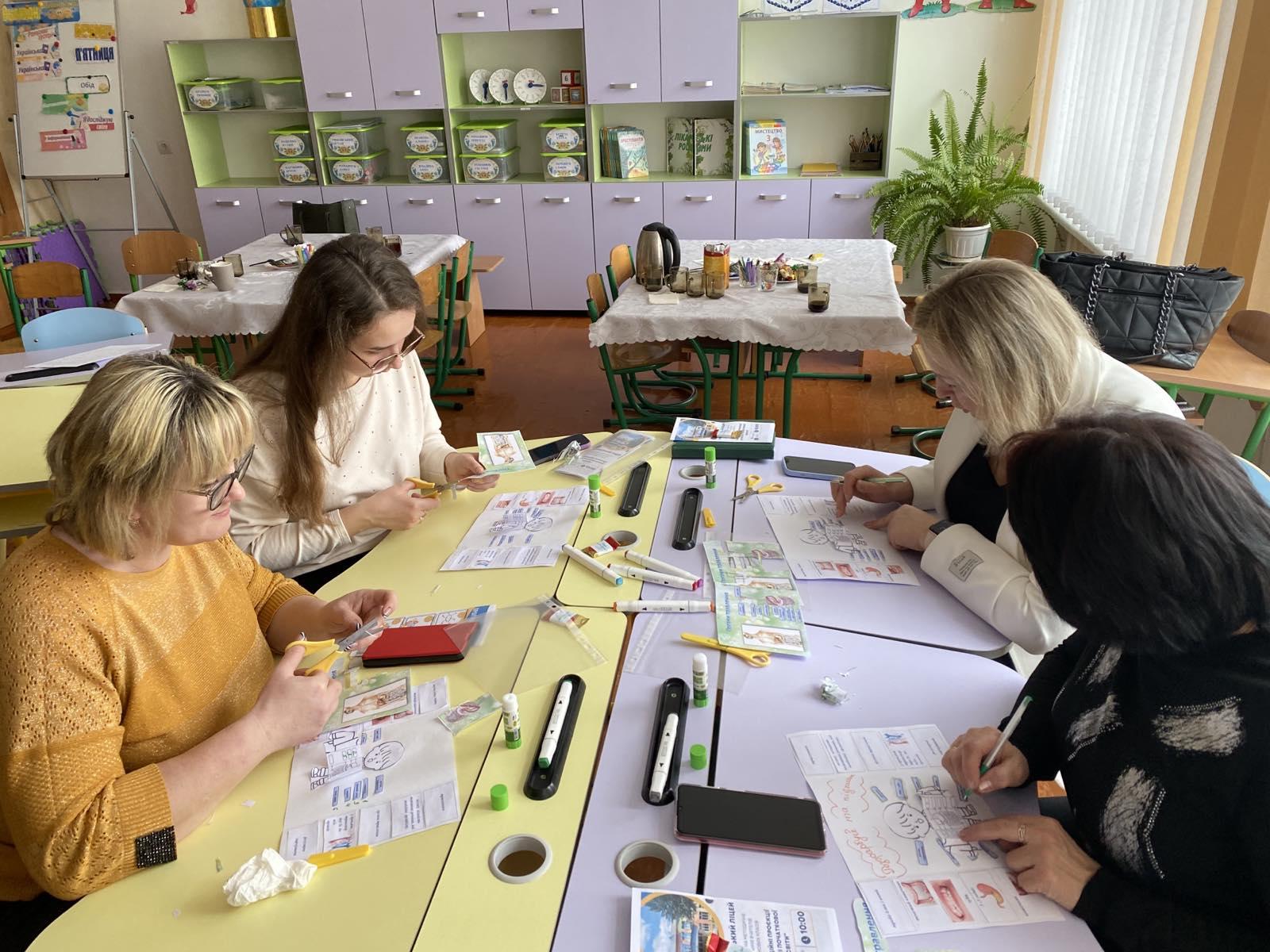 Вчителі початкової школи громади долучились до майстер-класу з виготовлення пантбуку (візуалізація навчального матеріалу у вигляді мальованої книги). Гнатюк Оксана Леонідівна, вчителька образотворчого мистецтва у Ратнівському ліцеї, змогла забезпечити атмосферу творчості та легкості на майстер-класі, що стало чудовим завершенням зустрічі.
