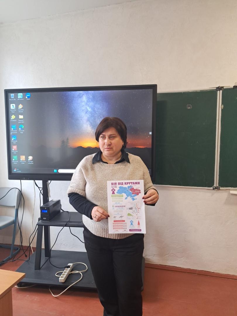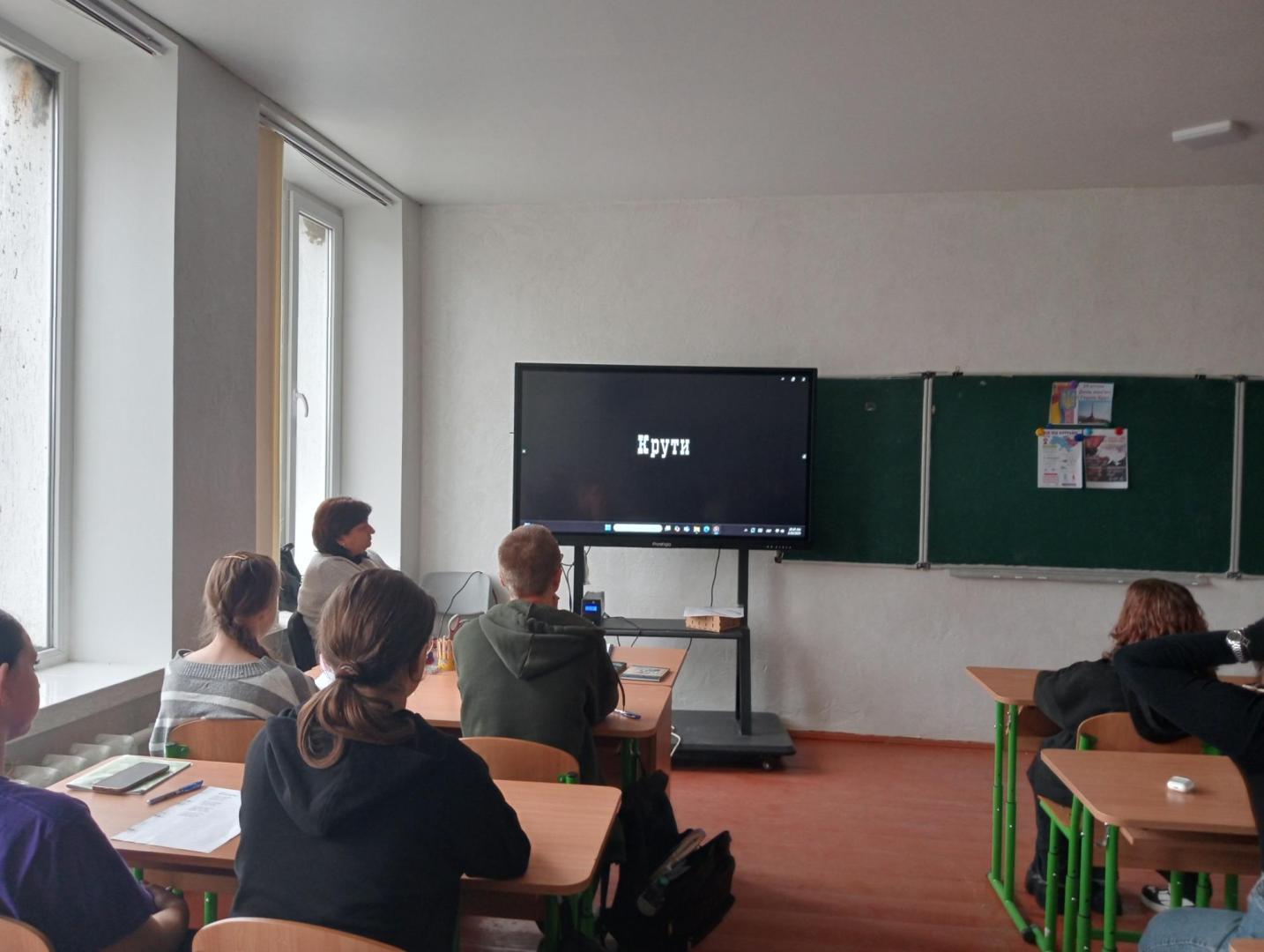 У вступному слові бібліотекар розповіла про передумови бою під Крутами та його учасників. Послухали пісню «Стежечка», присвячену подіям, та переглянули відео «Бій під Крутами».