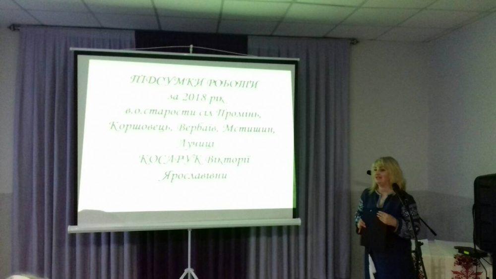 Після святкового концерту перед громадою прозвітувала Вікторія Косарук – виконуюча обов’язки старости сіл Промінь, Коршовець, Вербаїв, Мстишин, Лучиці. Вікторія Ярославівна не лише розповіла про результати діяльності у 2018 році, а й окреслила плани на майбутнє.