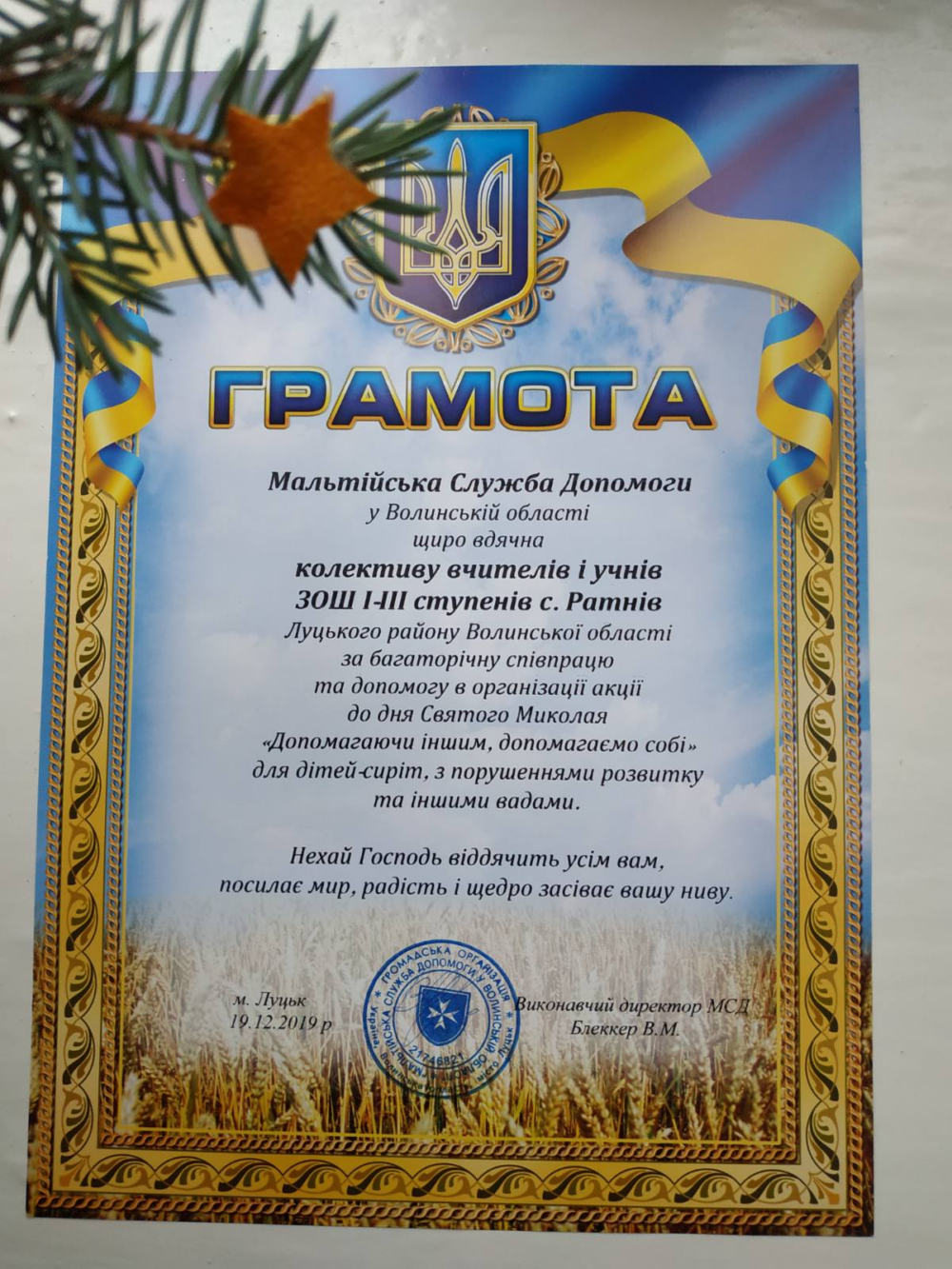 Дарувати тепло легко – у цьому вкотре переконалися учні та педагоги Ратнівської школи. Напередодні Дня Святого Миколая у закладі освіти реалізували благодійну акцію з однойменною назвою. Ініціативу організували за підтримки Мальтійської Служби Допомоги у Волинській області (керівник – Віра Блеккер) та координаторки Служби, вчительки місцевої школи Юлії Чмилюк.