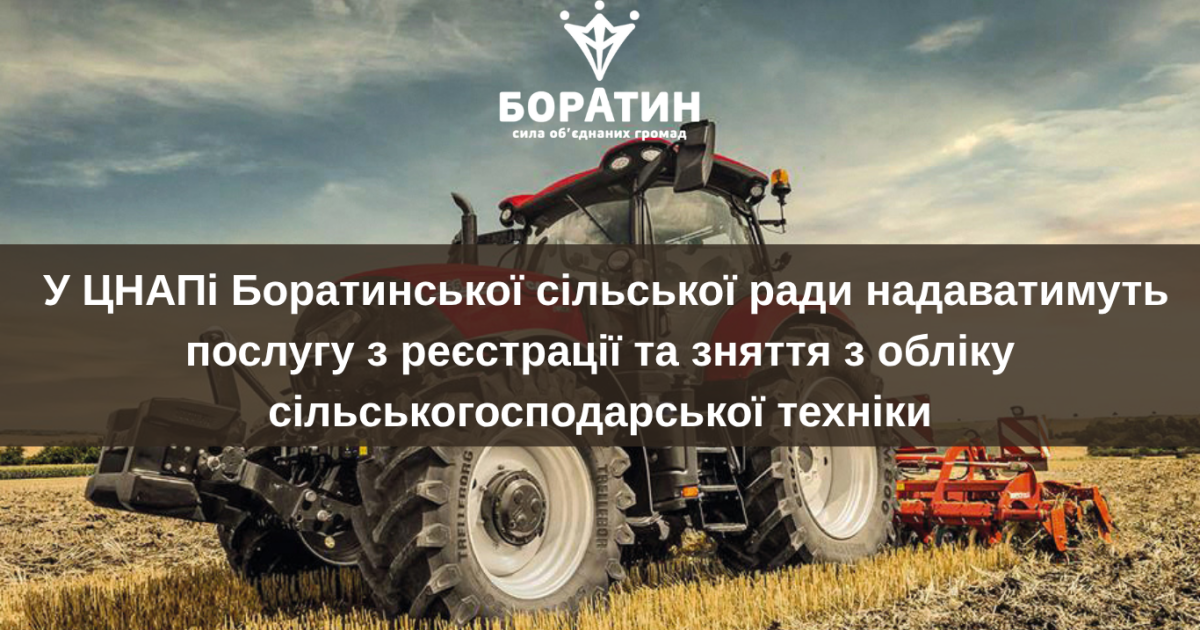 Центр надання адміністративних послуг Боратинської сільської ради розпочав надавати послуги з реєстрації самохідних шасі, сільськогосподарських, дорожньо-будівельних і меліоративних машин, сільськогосподарської техніки та інших механізмів, а також послуги зняття їх з обліку.