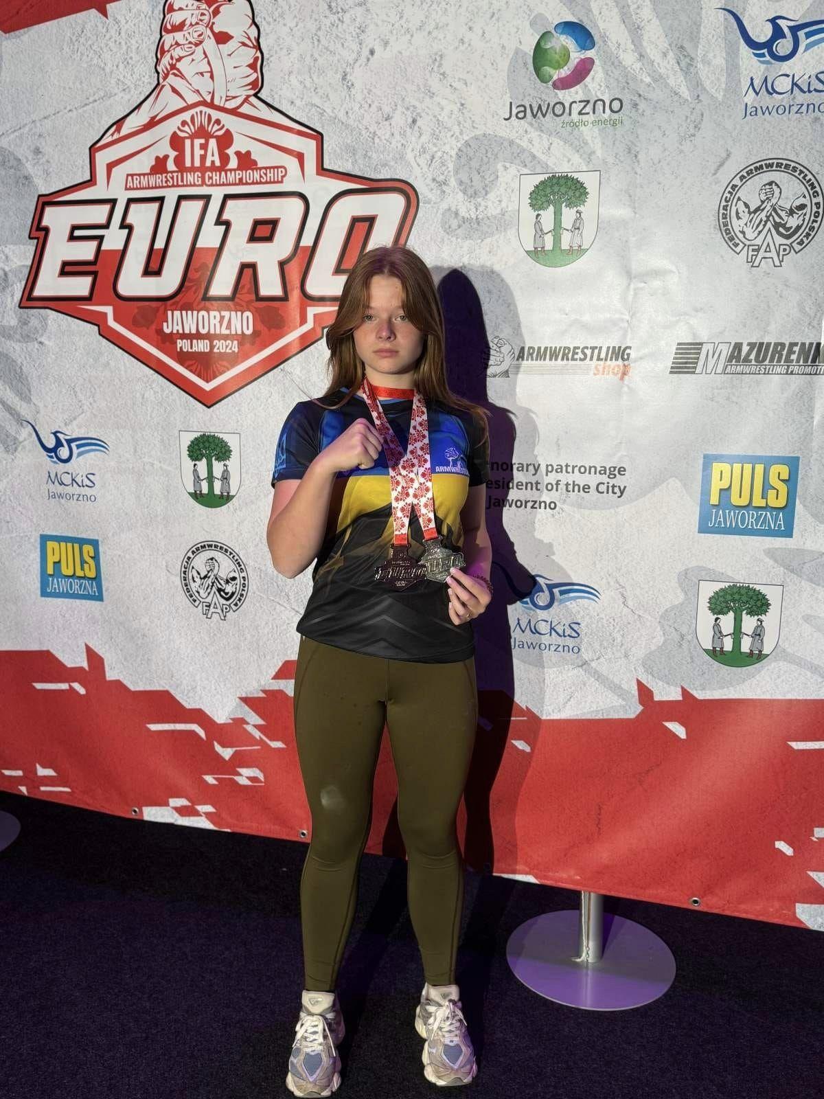 Учениця 9-А класу Боратинського ліцею Крістіна Повстюк змогла продемонструвати неймовірну витримку та жагу до перемоги. Вона змагалася у категорії дівчат 15 років і виборола дві срібні медалі – одну на ліву руку та одну на праву руку.