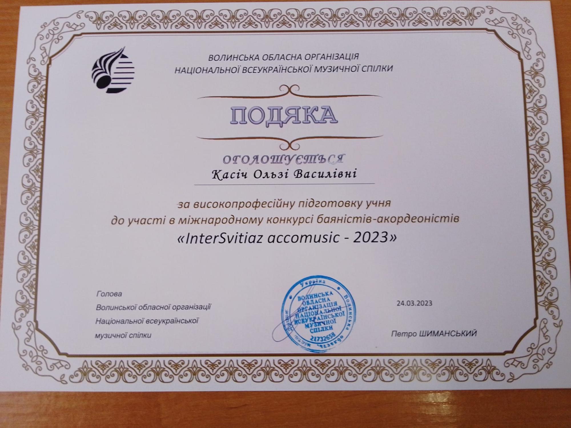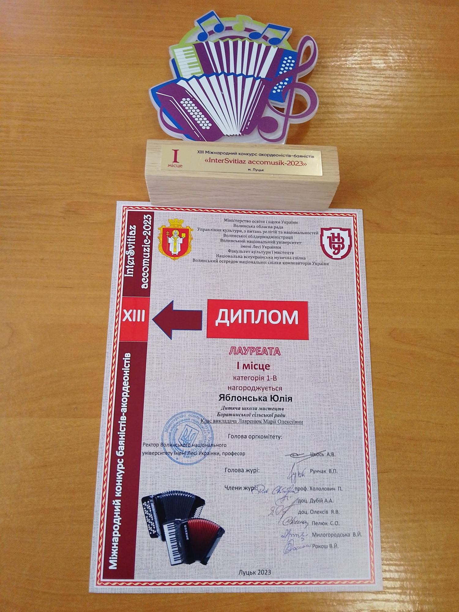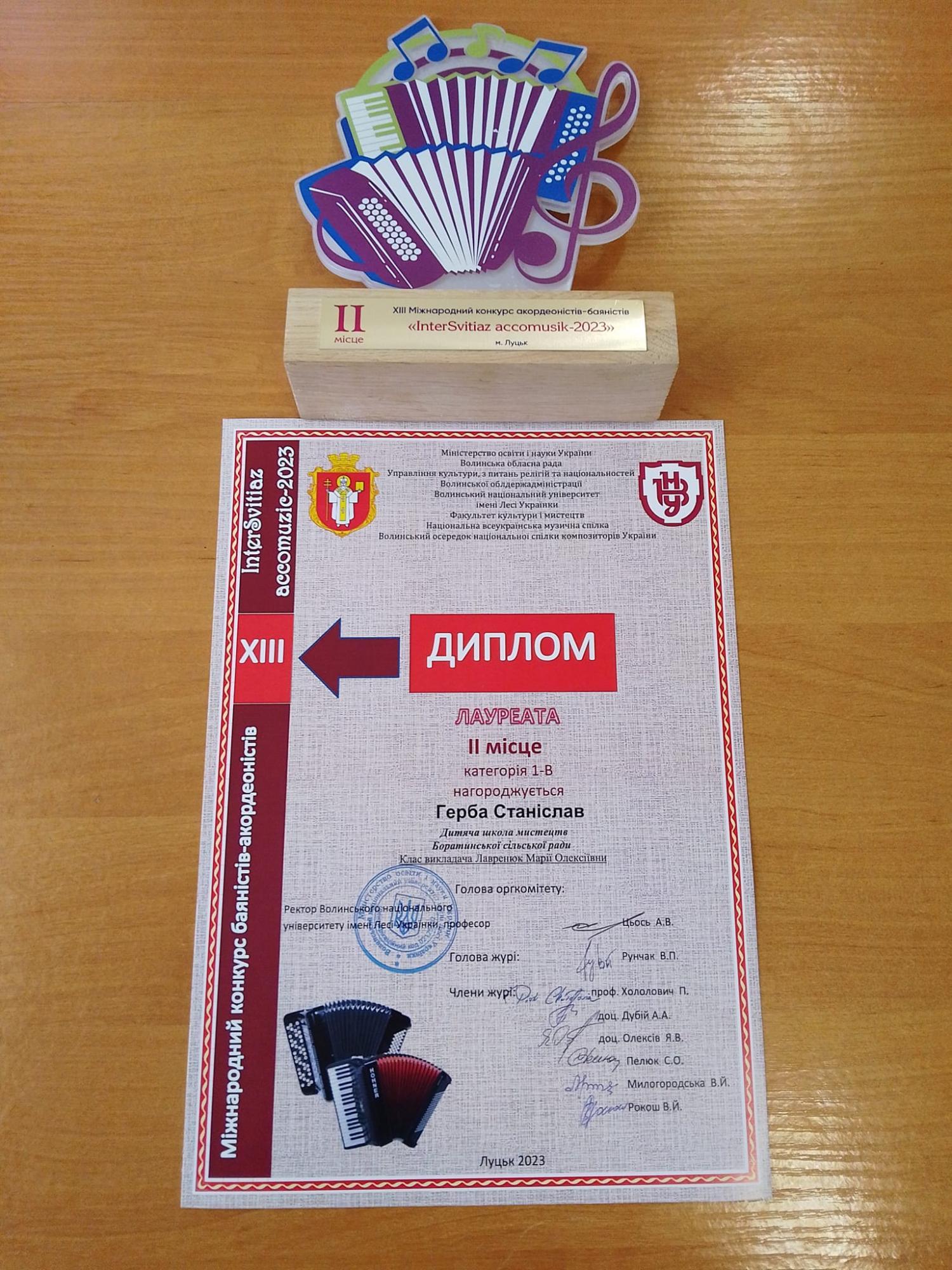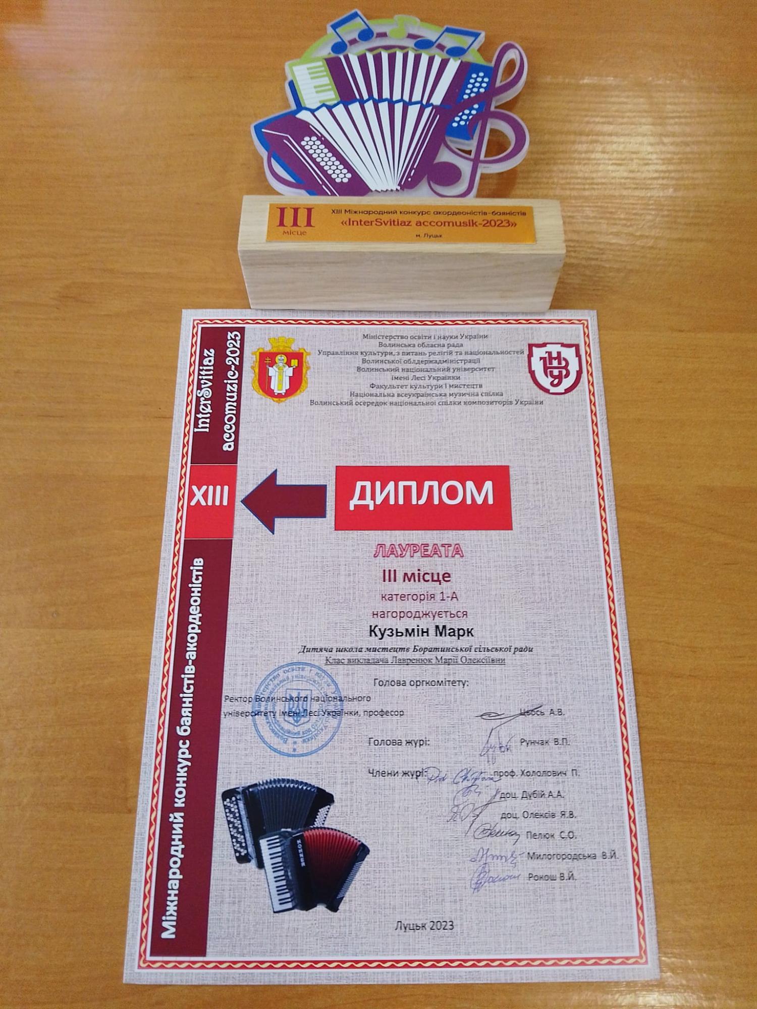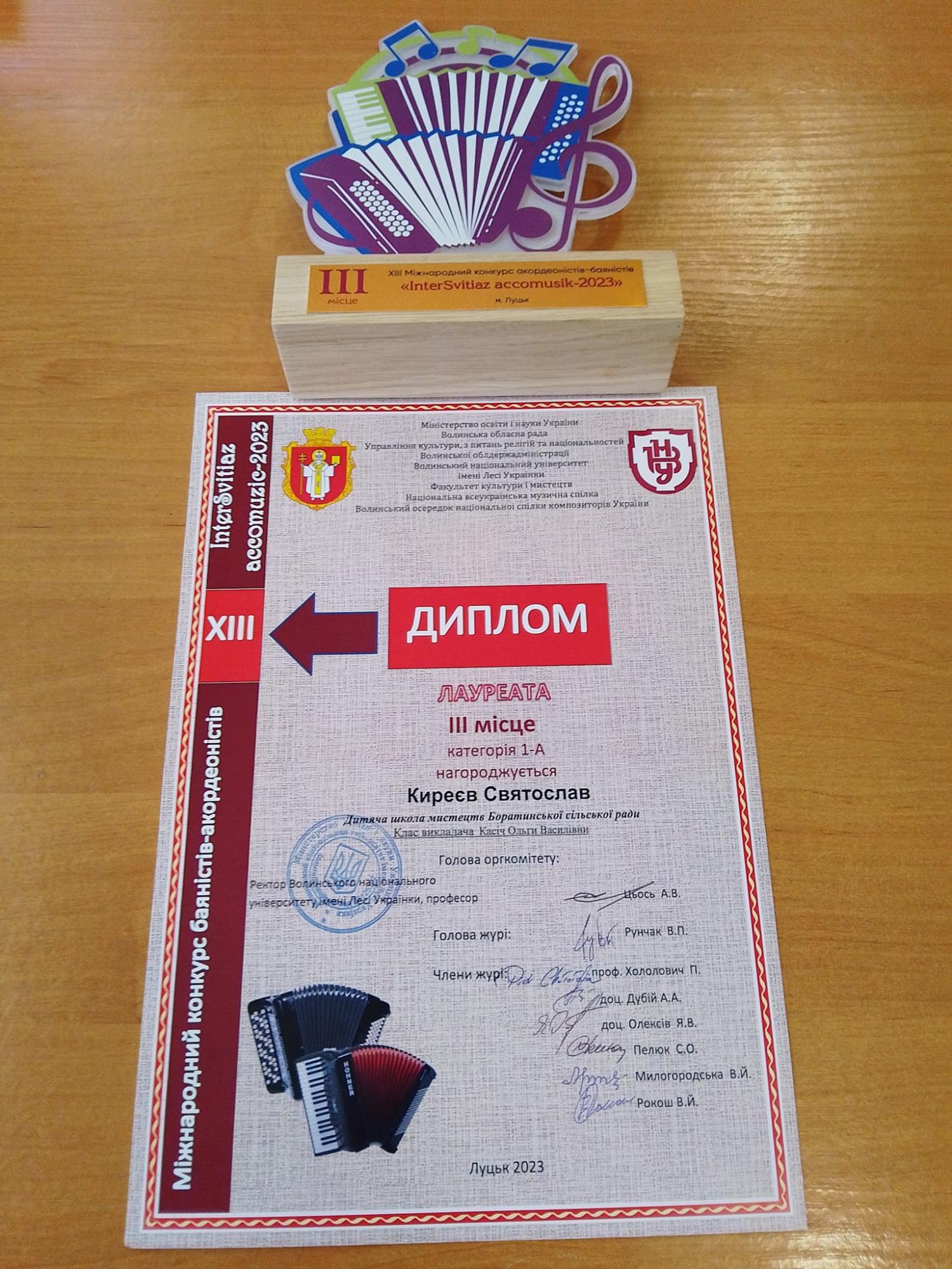 Незважаючи на умови воєнного стану, повітряні тривоги, відключення електроенергії, наші діти не втрачають почуття прекрасного і продовжують творити, змагатися та перемагати. Приємні результати для учнів дитячої школи мистецтв Боратинської сільської ради принесло підведення підсумків XIII Міжнародного конкурсу баяністів-акордеоністів «InterSvitiaz accomuzic-2023». Досягнення наших юних талантів такі: Юлія Яблонська - І місце, Стас Герба - ІІ місце, Марк Кузьмін та Святослав Киреєв - ІІІ місце.
