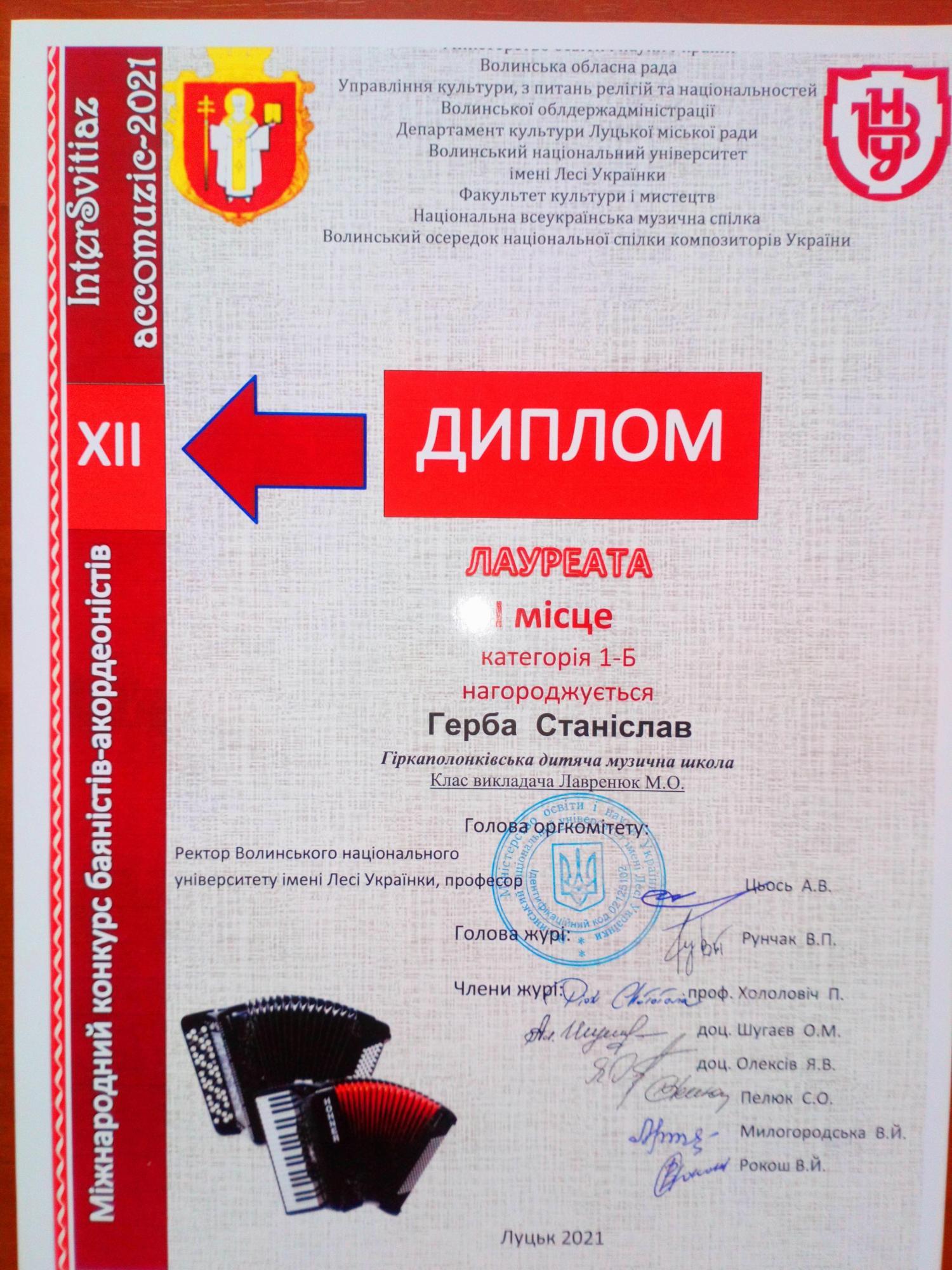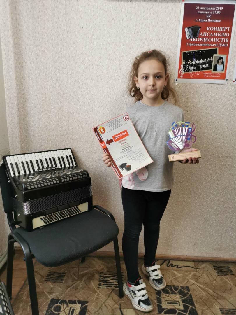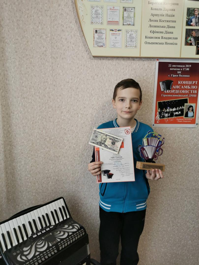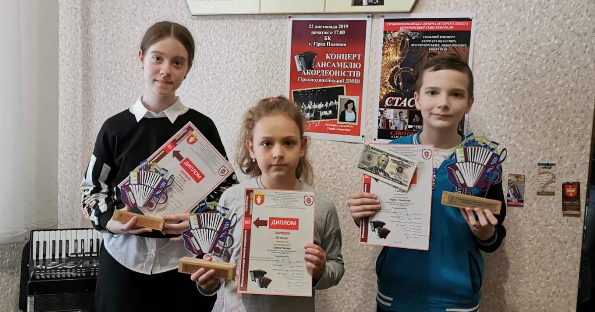 Приємно відзначити, що серед переможців престижного музичного конкурсу опинилися учні Гіркополонківської дитячої музичної школи. Стас Герба нагороджений дипломом лауреата за зайняте І місце та грошовою премією від родини видатного волинського педагога-баяніста Феофана Щегельського. Дипломами лауреатів за зайняті ІІІ місця нагороджені учениці школи Поліна Силка та Юлія Яблонська. Щиро вітаємо талановитих учнів та їхнього викладача Лавренюк Марію Олексіївну!