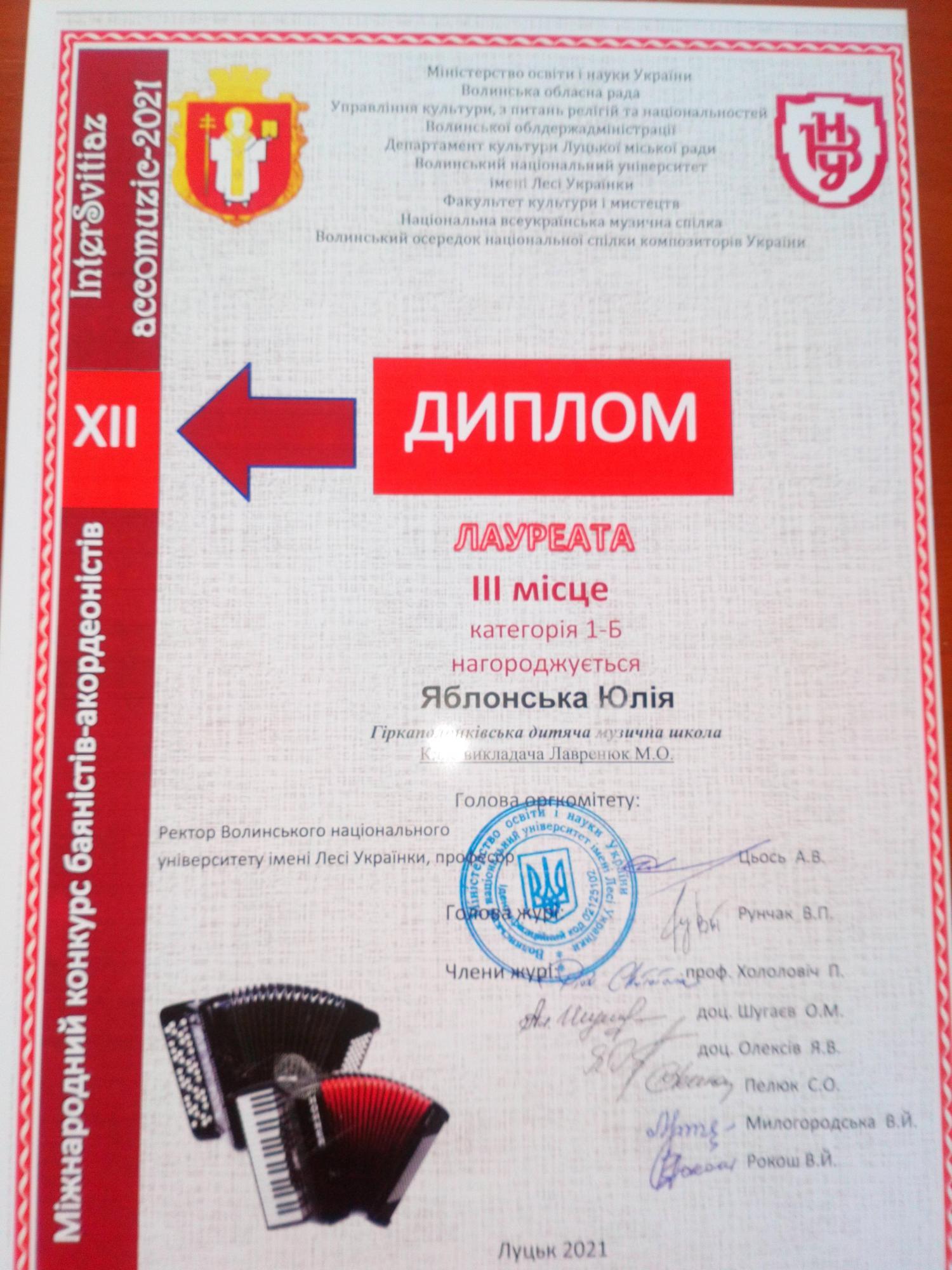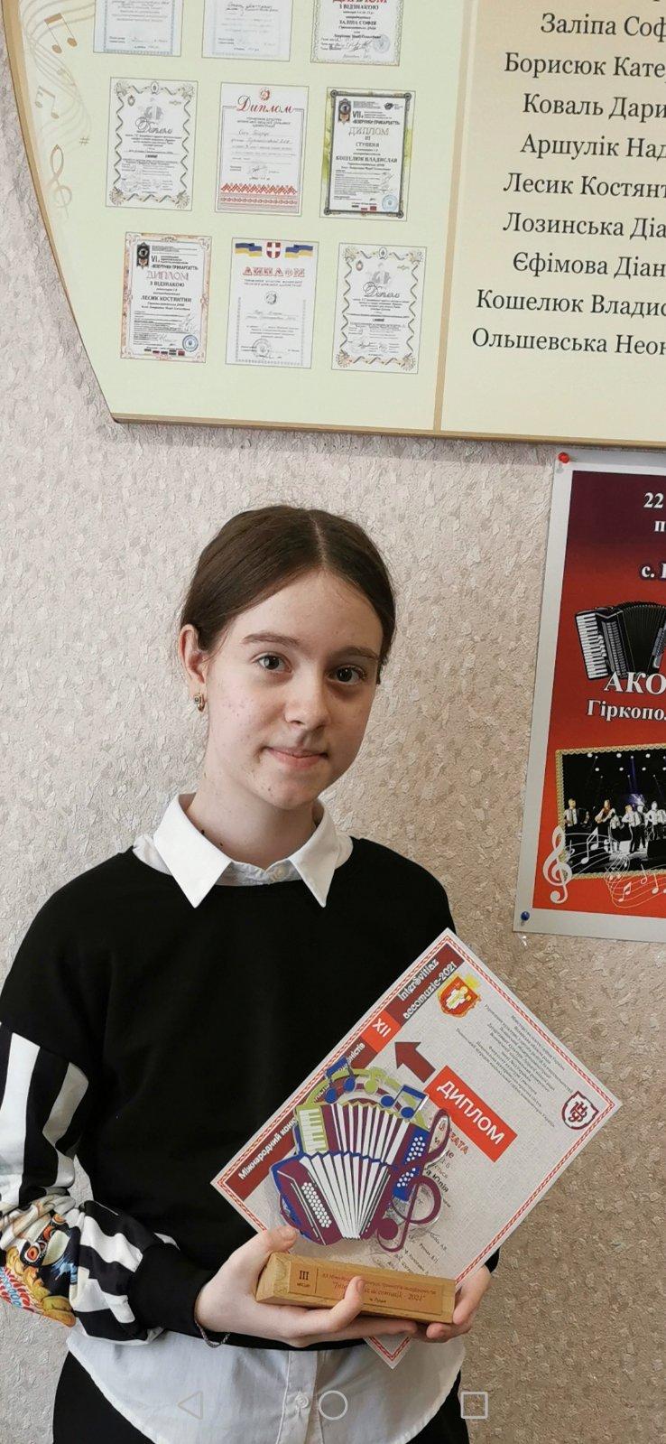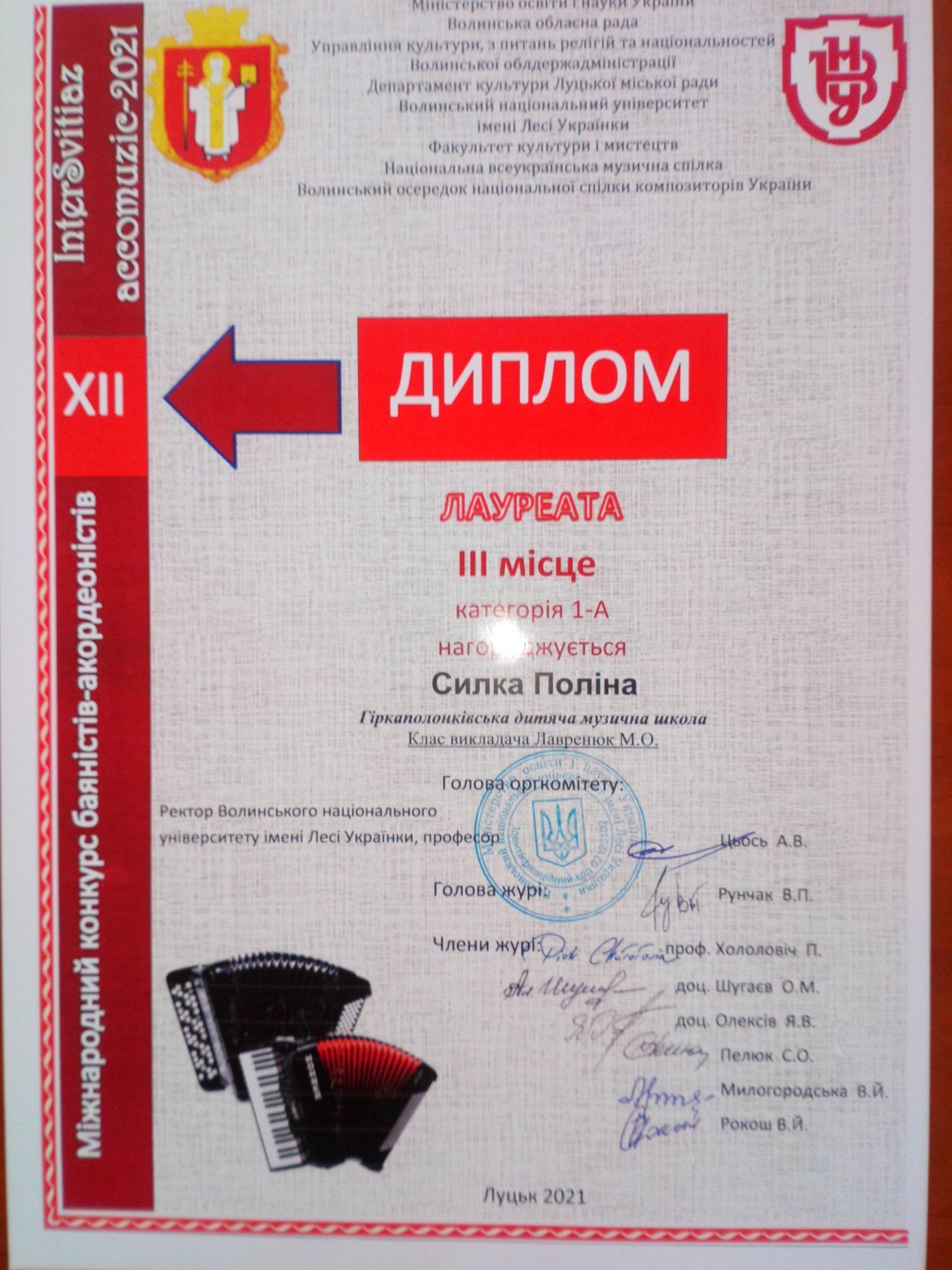 Приємно відзначити, що серед переможців престижного музичного конкурсу опинилися учні Гіркополонківської дитячої музичної школи. Стас Герба нагороджений дипломом лауреата за зайняте І місце та грошовою премією від родини видатного волинського педагога-баяніста Феофана Щегельського. Дипломами лауреатів за зайняті ІІІ місця нагороджені учениці школи Поліна Силка та Юлія Яблонська. Щиро вітаємо талановитих учнів та їхнього викладача Лавренюк Марію Олексіївну!