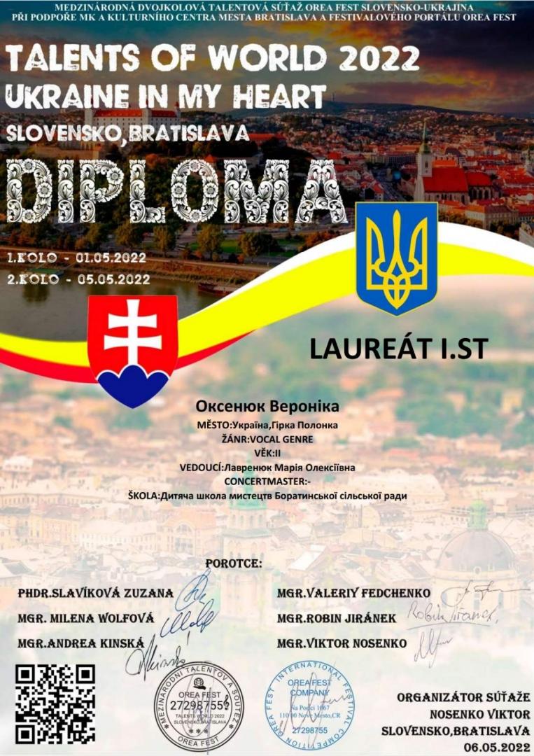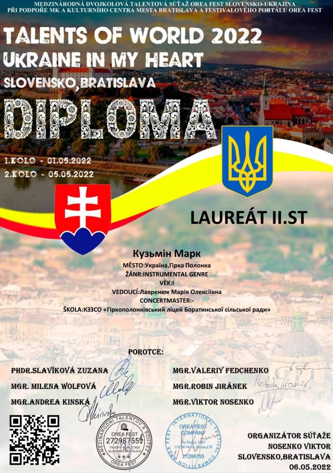 У рамках міжнародного проекту «Україна-Словаччина» завершився багатожанровий музичний конкурс «Україна в моєму серці. Талановитий світ-2022». Мистецьке дійство-онлайн організували у підтримку Збройних сил України.
