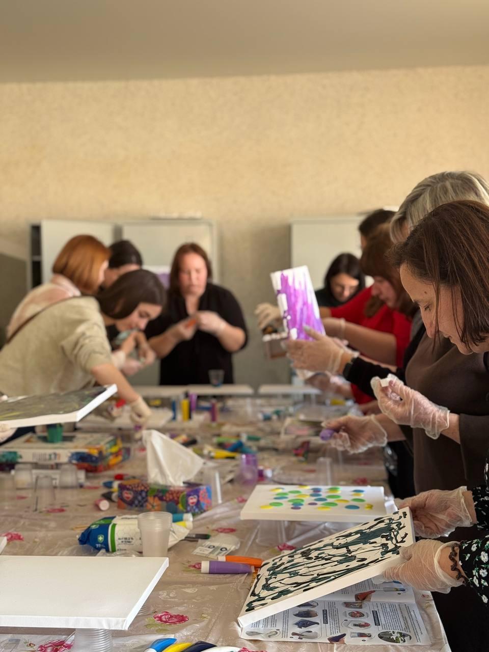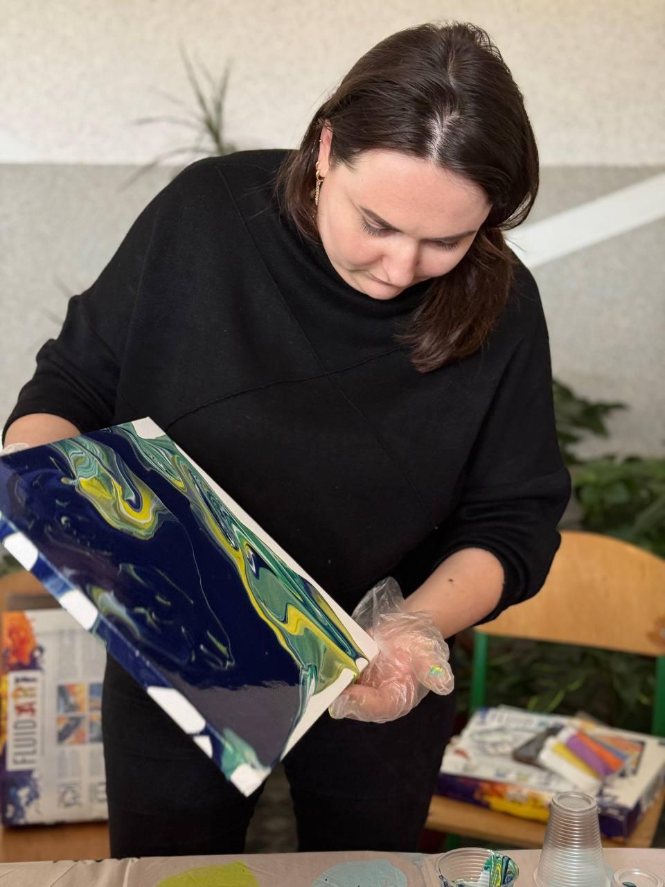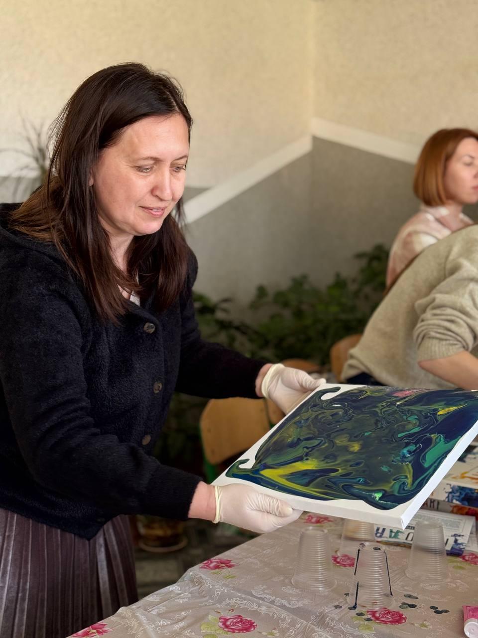 Щоб доповнити цю важливу розмову моментами радості та натхнення, учасники створювали картини у техніці fluid art. Усі поринули в процес, що не потребує навичок, але дарує відчуття свободи, спокою та внутрішньої гармонії. Кожен творив свою унікальну картину — яскравий візуальний образ свого стану, емоцій та надії.