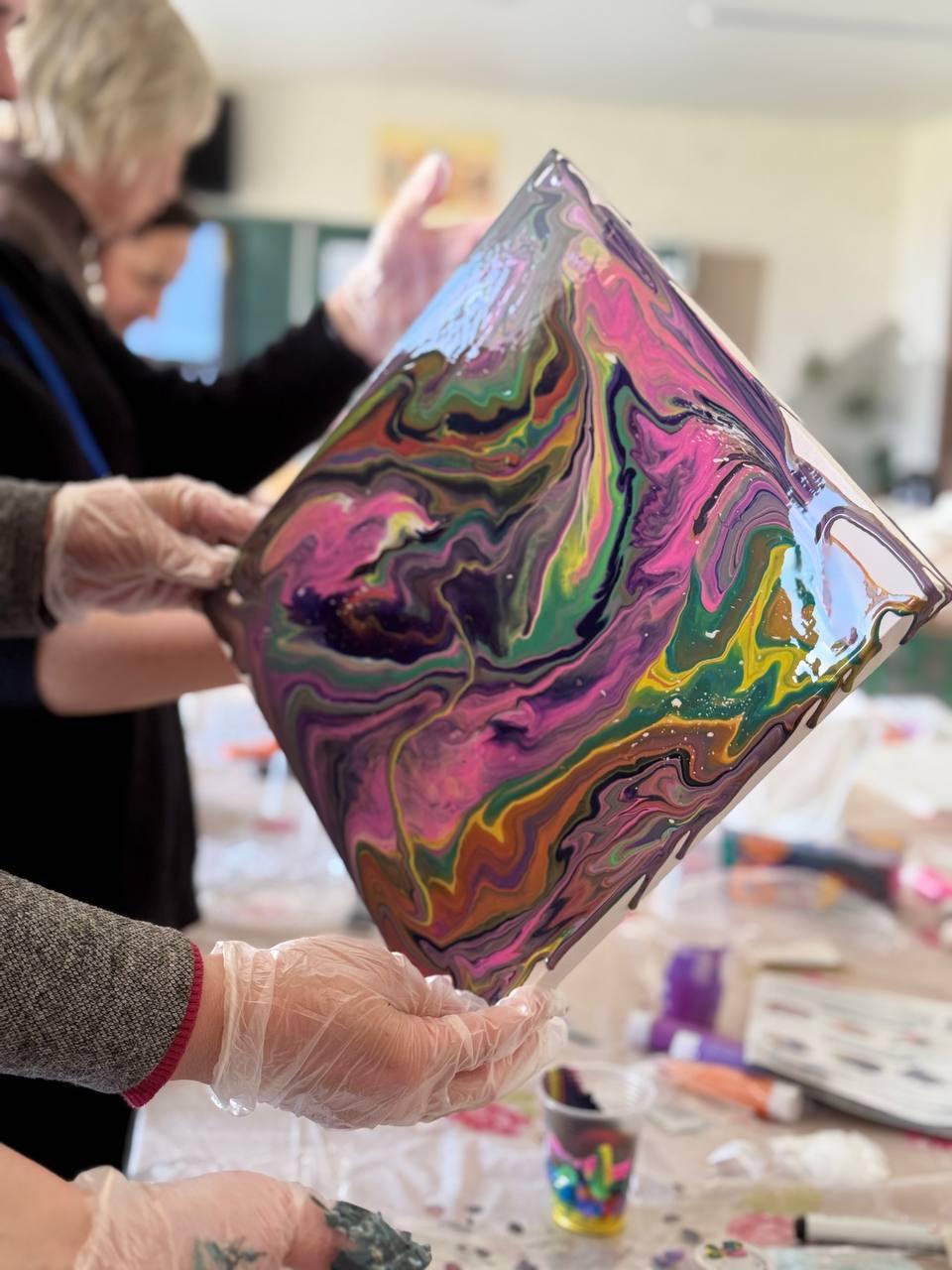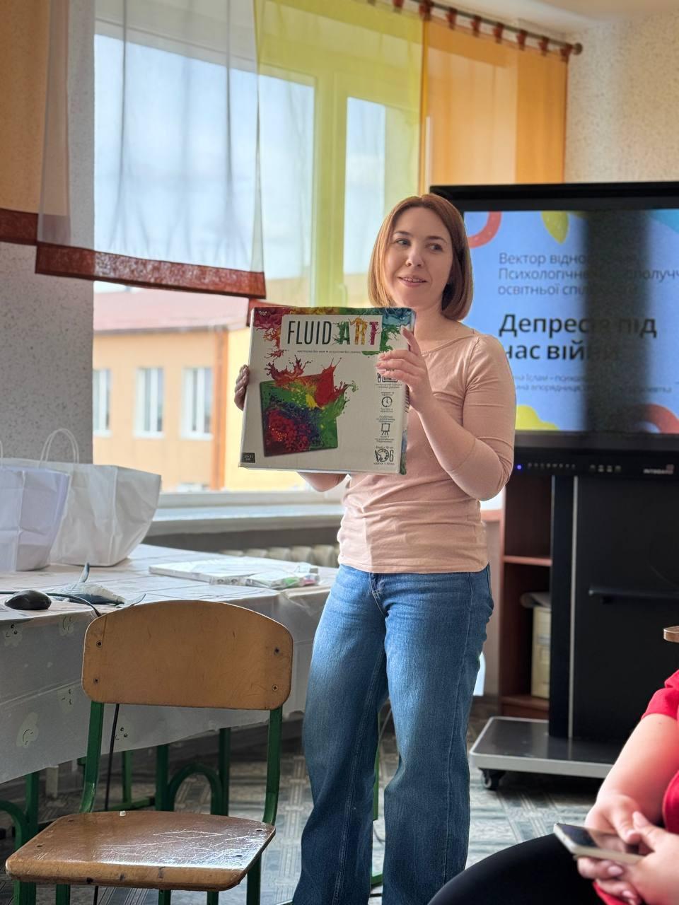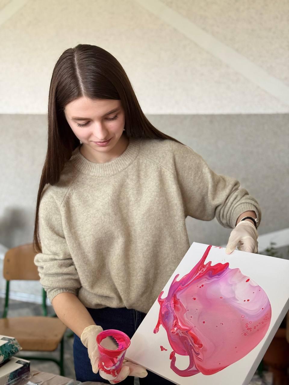 Щоб доповнити цю важливу розмову моментами радості та натхнення, учасники створювали картини у техніці fluid art. Усі поринули в процес, що не потребує навичок, але дарує відчуття свободи, спокою та внутрішньої гармонії. Кожен творив свою унікальну картину — яскравий візуальний образ свого стану, емоцій та надії.